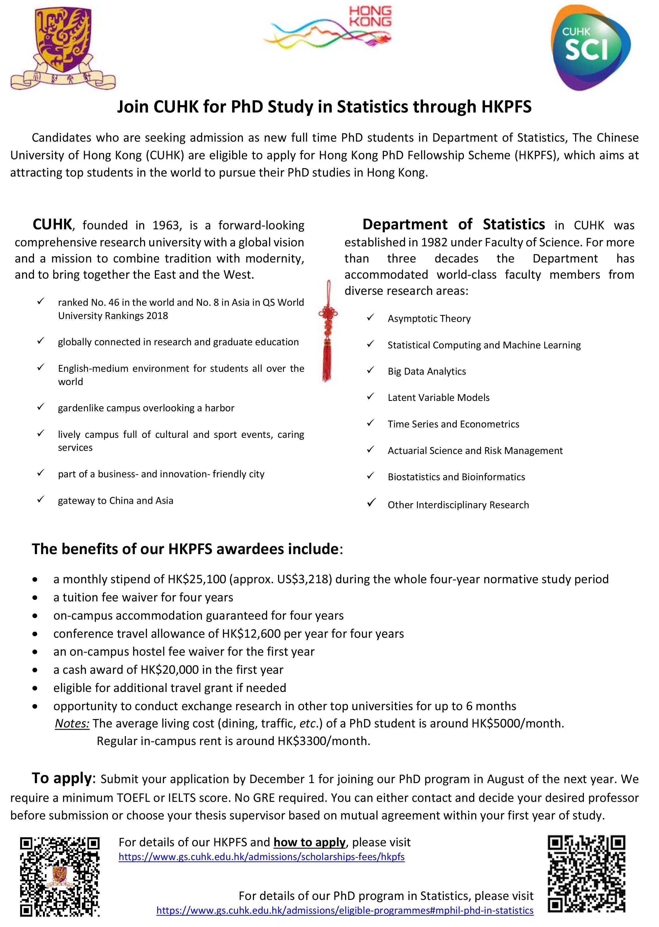The Division of Statistics provides M.Phil./Ph.D. programmes in Statistics under the Faculty of Science of The Chinese University of Hong Kong. The objectives are to extend the frontiers of research in various fields of statistics and applied statistics, including but not limited to Finance and Econometrics, Asymptotic Theory, Time Series, Biostatistics and Bioinformatics, Latent Variable Models/Structural Equation Models, Multiple Comparisons, Spectral Density Estimation, and Statistical Computing.
