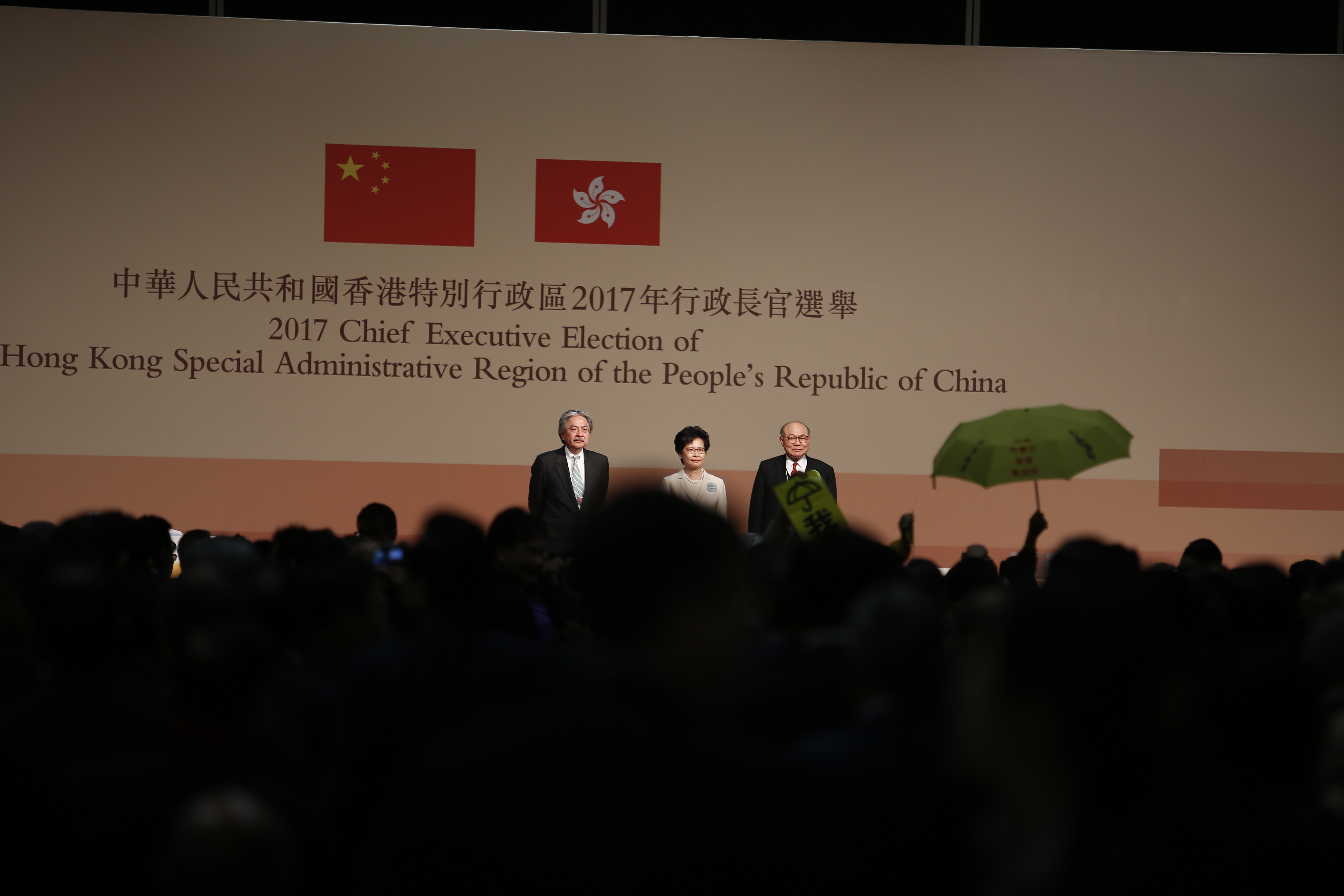 宣布林鄭月娥當選一刻,有選委舉黃傘抗議。