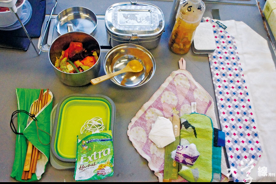 馮伽熺每天隨身攜帶的減廢「法寶」包括餐盒、竹餐具、毛巾等。工作室亦備有額外餐具借予同學。(潘祖兒攝)