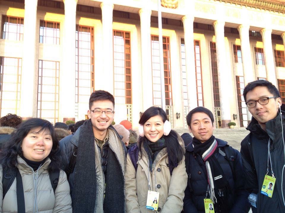 陳妙玲(左一)與港台同事採訪2015年全國兩會。 (受訪者提供)