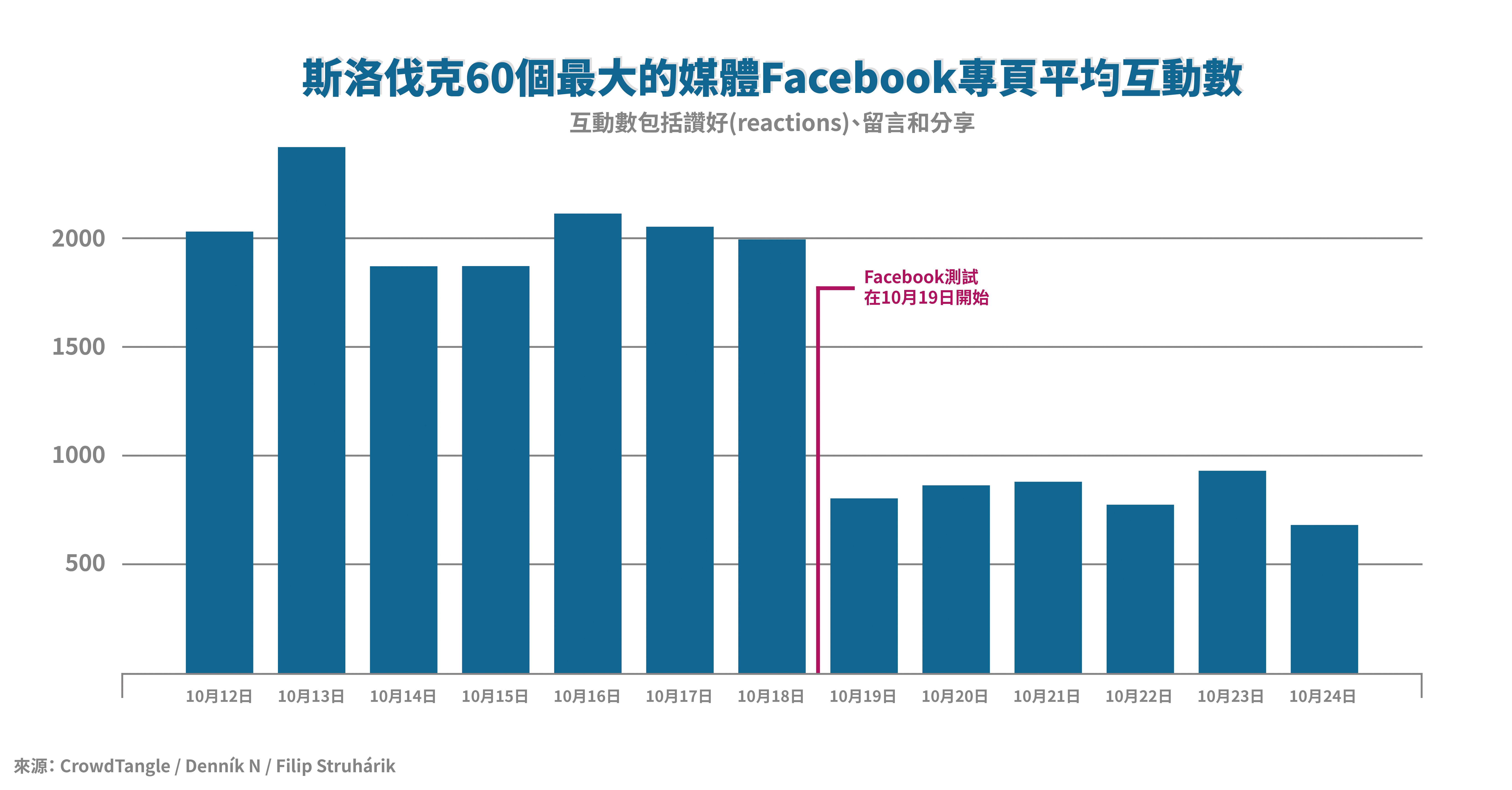 斯洛伐克記者分析facebook專頁數據,發現自測試開始後,當地60個最大媒體專頁的互動數下跌一半。