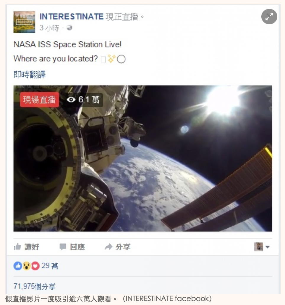 去年有Facebook專頁直播太空人步出國際太空站片段,「01熱話」記者向美國太空總署 (NASA) 查詢後,證實片段是偽造。(《香港01》網頁截圖)