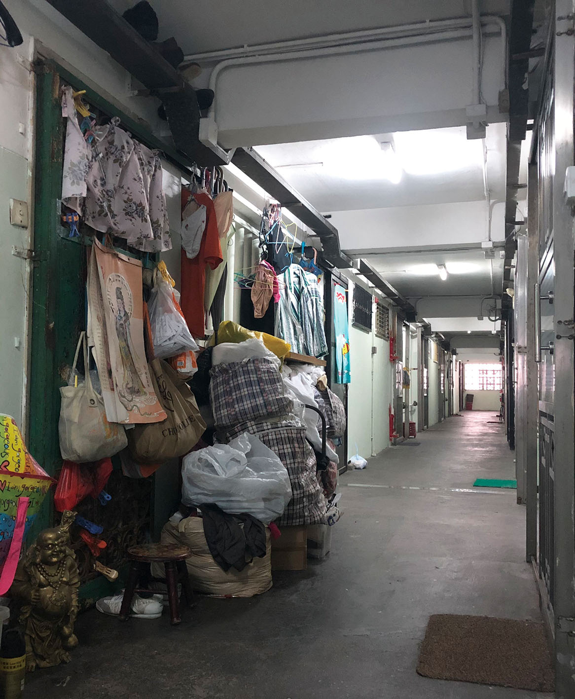 太古樓居民何婆婆以買賣舊物維生,屋內堆滿雜品,就連走廊通道亦堆積如山。 (伍珍珍攝)