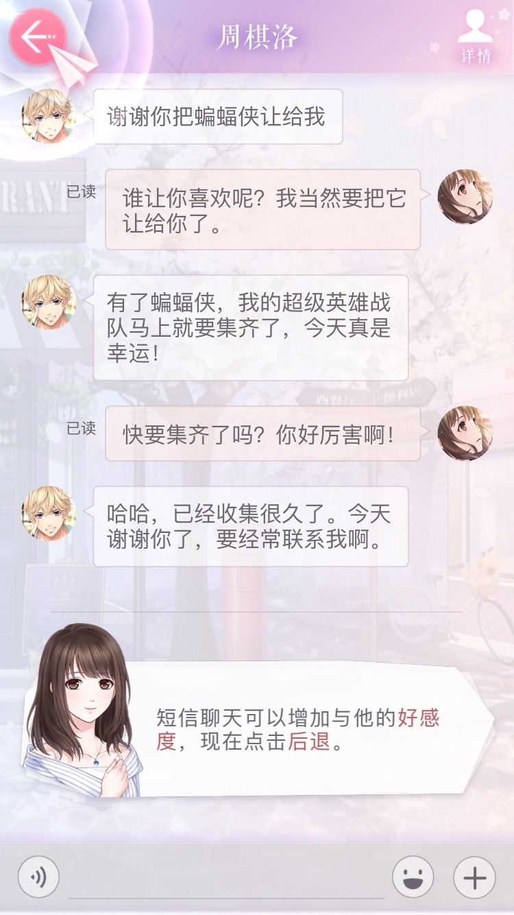男主角們亦會發短訊傳情,與玩家建立戀愛關係。短訊內容不限,有時對玩家說故事,有時約玩家外出,有時對玩家表白。(手機截圖)