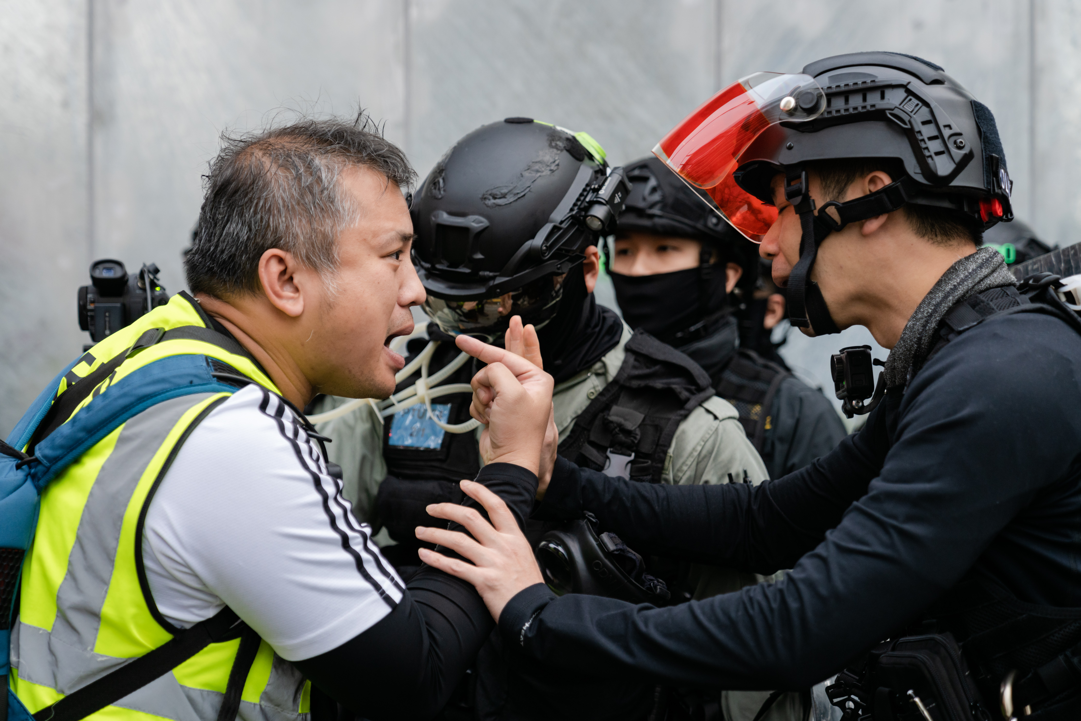2020年1月19日,一名在中環昃臣道採訪的記者不滿被防暴警察驅趕,與防暴警察理論。(攝:Nasha Chan)