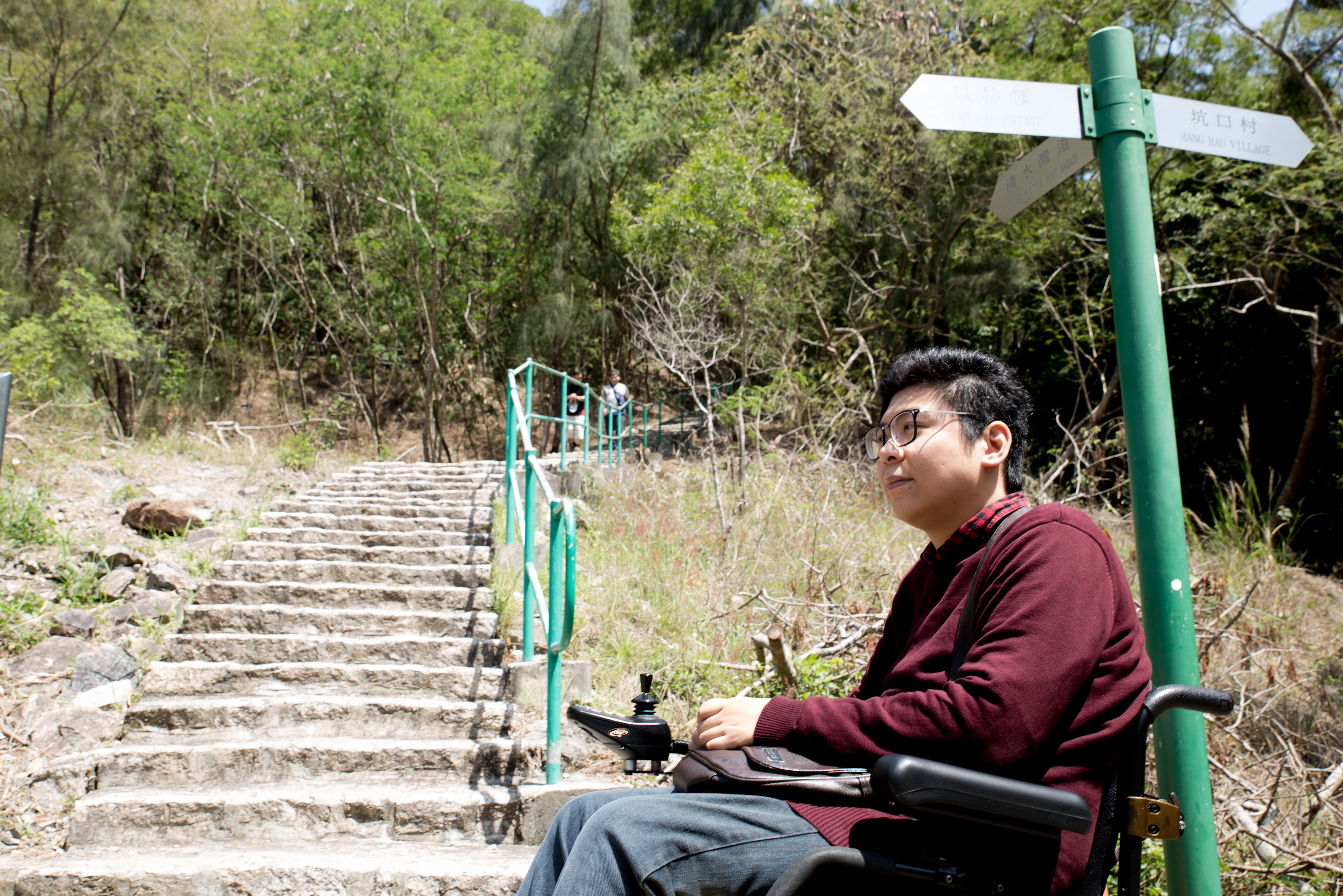 蘇永通傾向行短程路線,如將軍澳鴨仔山。鴨仔山前半段路是稍具斜度的石屎路,他能輕易應付,但行到中途、遇到通往清水灣道的梯級便需繞路。梯級是輪椅使用者行山一大障礙。(陳詠欣攝)