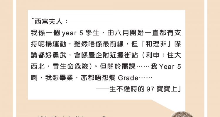 關於罷課,我⋯⋯—— 西宮夫人的信箱 49屆「逆流」(19-20), 罷課, 罷課號外1 「西宮夫人:我係一個year 5學生,由六月開始一直都有支持呢場運動,雖然唔係最前線,但「和理非」嚟講都好勇武,會喺屋企附近擺街站(利申:住大西北,冒生命危險)。但關於罷課⋯⋯我Year 5喇,我想畢業,亦都唔想爛Grade⋯⋯——生不逢時的97寶寶上」 生不逢時的97寶寶:首先,我覺得你太驚。罷課,唔等於畢唔到業或者爛 Grade。相信大家都試過走堂,甚至有人會走一星期去旅行都好平常,你會唔會真係因為走咗一兩堂而爛Grade、畢唔到業?照現時講法,罷課遠遠未去到會令你 Defer 嘅程度。所以你唔駛咁驚住。 的確,未來真係有機會變成無限期罷課,代價遠比罷兩星期高,但係可以到時再算啦。諗返呢個夏天,成個香港都付出咗好多,有咁多手足為今場運動而犧牲、被捕、頭破血流,而罷工嘅就可能已經冇咗份工。要改變個社會,總係需要好多人付出同犧牲,你覺得你自己做到幾多,都係要你自己判斷下? 西宮夫人上 「西宮夫人:依家學界叫緊人去罷課,我唔知罷唔罷課好。呢三個月好累,每個星期六日都留咗去發夢,我唔知罷課之後有咩用。罷課之後係咪又只係延續之前三個月嘅堵路、和理非集會、撚狗呢?好似已經塞住咗喺呢個位好耐,同埋呢啲嘢喺星期六日都做到,唔駛罷課都得啦。夫人,你點睇?——戴著 3200 食催淚彈放題的街坊上」 戴著3200食催淚彈放題的街坊: 我會話,罷課本身就係攬炒,即係如果佢唔讓步搞到好多人啲科 F 晒,校方行政上都會好煩。而且學生長期罷課本身就好大件事,所以遠遠唔係無用。 而且我估好多人都無諗過嘅係,罷課可以比我地抖下。所謂「大家都累了」(Lam, 2019)都錯唔哂,講真由六月 Chur 到依家,都真係唔嘢少。如果想九月十月繼續作戰,就必須要有抖下嘅時間。罷課的話,一方面可以持續出去抗爭之餘又有得抖下,另一方面真係多咗成堆大學生,要聚埋一齊用大學生名義搞啲嘢,例如迫校方高層表態都易好多。 西宮夫人上 「西宮夫人:我200萬+1嗰陣有出過一次,平時喺Facebook、IG都會望下朋友Share嘅新聞,大概都知發生緊咩事。本來我冇諗過咩罷課,但有好熱血嘅朋友問我罷唔罷課,我為免尷尬,就講咗會考慮下⋯⋯但其實我就冇認真諗過,但唔太想諗同唔太想罷。——冷氣妹上」 冷氣妹: 其實你咁樣問得,你個心都有少少想罷啦。只係你一直都唔係咁主動參與,估唔到自己會願意做到罷課呢一步,所以先喺度同我講,可能你都想睇下自己會唔會被說服,又或者你想 Justify 自己唔罷。 我自己都有朋友以前唔關心政治,從來都冇去過遊行。但自從 6 月出過一次之後都有 Keep 住出去,仲會主動約我去遊行。我都好詫異,點解個變化咁大。但佢哋嘅講法都係話,喺參與運動嘅過程當中,遇見觸動到自己嘅事,令佢哋想繼續參與喺運動裡面。 我會話,試下,睇下你會從中感受到啲咩? 西宮夫人上 分享至: Leave a Reply Cancel Reply Your email address will not be published.CommentName* Email* Website 在瀏覽器中儲存顯示名稱、電子郵件地址及個人網站網址,以供下次發佈留言時使用。 − 一 = 七 Δ