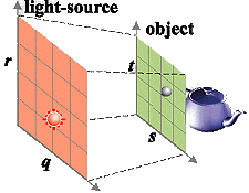 - A new image representation that incorporates illumination is proposed. It can be regarded as the dual of light field representation. The light source position (point source) is sampled on an additional light-source plane (qr). However, the 4D function does not directly represent the irradiance incident on object surface, since it is the radiance that is seen by the observer. Instead, it stores the reflected irradiance of light when a point source is located at (q,r). Hence, we call this four-dimensional function of (q, r, s, t) the reflected irradiance field.