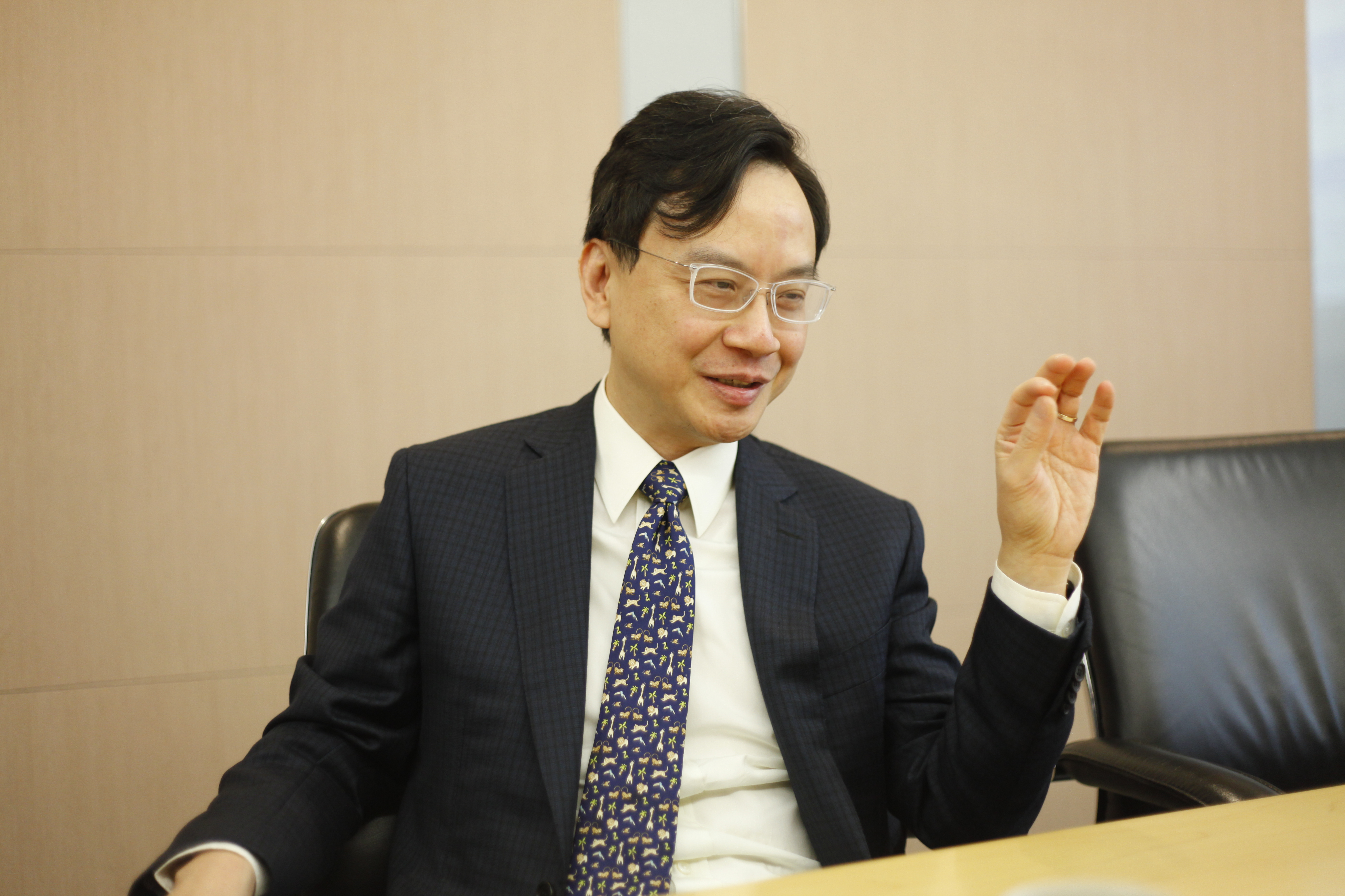 盧煜明西裝筆挺,只有低調的暗紋,領帶卻是鋪滿長頸鹿和獅子等動物圖案,饒有趣味。(黃靄兒攝)