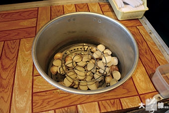 譚伯在不銹鋼煲底放入蜆殼,水沸時蜆殼會相撞發聲,提醒他適時加水以免弄壞煲子。(徐紹軒攝)