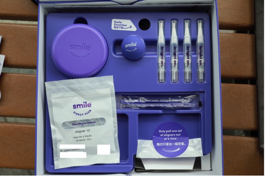 上圖為美國公司Smile Direct Club的箍牙套裝,牙套包裝(左下)印有區小姐負責牙醫名字Dr. Walter Heidary,是一位加拿大持牌牙醫。(受訪者提供)