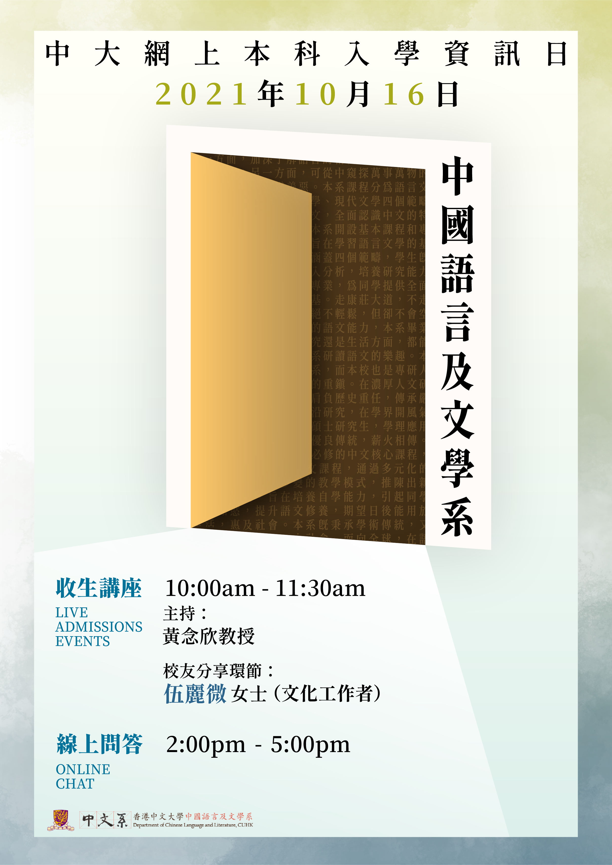 香港中文大学将于2021年10月16日(六)举行”中大网上本科入学资讯日“,中国语言及文学系除开设网上展位外,将以视像形式举办收生讲座,简介最新本科课程及入学资讯,嘉宾伍丽微女士更将分享就读本系心得。本系亦会另设线上问答环节,由本系助教解答大家对本系课程、校园生活等的问题。