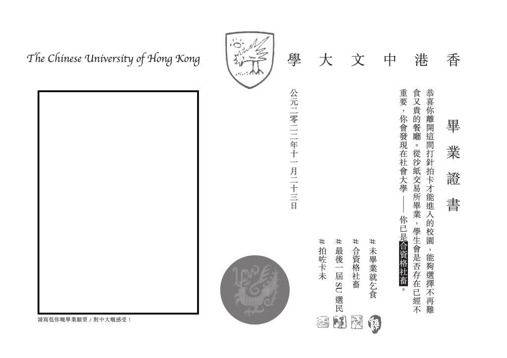 【投稿文章】抗議學生的自白——也許我們從未與支持者對話 投稿, 2022年 11月 在畢業禮穿上寫著訴求的垃圾袋作畢業袍,cosplay保安和閘機與同學合照,經過曝光與醖釀,支持者的留言一片「美麗新中大」、「保安濫權」,就像其他社交媒體帖文一樣。 是的,小小的行動上升至保安以人鏈包圍聲援者,甚至報警威嚇,足見中大的暴力與無賴,我們也希望向支持者答謝聲援。 但更多的是,我們認為訴求不被理解。 事件得到多大曝光,我們的訴求便同等地失焦,甚至被描述成「文青左膠」的行動,傳媒漸漸被培養成有警民衝突的畫面才會關注,亦都只選取這些畫面特寫。 我們故意挑選「非政治性」的題材,正是要拷問:為什麼這些問題在示威場合不會被提及?為什麼它們會被理解成不重要和沒有對抗性? 請容許我們花一些篇幅介紹標語的具體意思: 一、「沙紙交易所,合資格社畜」:有多少人踩著同儕擠進大學、擠進中大,是為了追求知識和自我實踐?如果畢業證書不和求職、收入、階級掛鈎,又有多少人會將四年時間花費在象牙塔裏? 畢業禮的歡快氣氛,仿佛是即將開始40年不平等勞動、面對社會絕無僅有的福利保障的挽歌。勞動權利自從2011年的最低工資後,防止畢業生做到變成黎生的標準工時、集體談判權還遲遲沒有落實,工傷事故頻生卻從沒人問責。社畜面對的問題,絕不只是朝九晚六的無盡勞動,而是對經濟和生活自由的反詰。 二、「Canteen好L貴、未畢業就乞食」:CC can頹飯現在叫價$18,其他新餐廳一餐已經$40起跳,而且還是劣食,為何由公帤資助的中大全然商業掛帥?沒有正式收入的學生如何負擔起這種價格? 受歡迎的「一起素」和med can(李卓敏基本醫學大樓小食店),他們的食物美味營養、價格低廉,然而在學校開了幾回不能公開成員名單的校務會議後,突然就要執包袱走人。大部分員生完全不被包括在決策當中,也不理解為何有口碑的餐廳不獲續約,新同學已經不知道檸檬批和素水餃為何物,也糊里糊塗地被迫接受不透明程序下作的決定。 三、保安、閘機、針大通:閘機的紅燈亮起,代表「中大通」失效,這樣一刀切強逼所有員生打針不講人情,更是將中大設限。豎起了一個個閘機,同學一入校首先面對的是保安審查的姿態,學校自行築起了一個無形的圍牆,這個圍牆代表著猜疑和仇視自由。 如果我們追求自由的大學,不如正視校園内缺乏長期開放的室內空間,而室外看似自由的地方亦潛藏不同限制——例如今日大家在百萬大道的行動,只要引起學校一點關注,同學也會輕易碰上可以任意挪用的大學規條。「公共」意味著不應審查和設限,進出圖書館、「公共空間」的電子鎖和拍卡系統指向的是排除,大學將受社會資助的知識庫、空間私有化,為它纏上種種鎖鏈。 四、「最後一屆SU選民」:憑弔學生會的外殼並非重點,因每年選舉總是剛剛好過投票門檻,仍不太感受到學生代表的存在或倡議,也許我們需要意識到學生會的溝通做得不太理想。 不過,即使學生會形大於實,作為最後一屆參與過學生會選舉的學生而言,確實感受到比起校方直接委派代表、拒絕溝通的現況,能夠多一點點表達的渠道,有多一點點自主的空間。 失焦 以行動後寫文這種形式説出我們的論述,正好檢驗了事件的失焦,也道出行動的內涵實際上並不受關注。 以往畢業禮的行動往往是嚴肅正經的,打著最顯眼政治性的口號示威,圍觀的人除了稱讚,也生出距離感,加入總是需要一些勇氣。但如果我們期望的民主是溝通和理解,單向傳播信息絕不理想。 我們時常聽到大家在網上抱怨 canteen、拍卡、畢業前景等問題,本以為以cosplay這種幽默詼諧的形式,可以拉近與同學的距離,鬆動校園議題「現實就是這樣,不能被動搖」的既定印象,並且引起同學共鳴,反思看上去不太「政治」卻主宰著我們生活的現象。 但讓我們詫異的是,期望達到的討論鮮有發生,與親友合照的喜悅氣氛和我們的行動形成隱形的界。雖大部分同學願意接下傳單,也有少數同學與我們合照交流,與保安衝突時同學紛紛圍觀、聲援,但更多是意外或無感。 焗促,除了是無處吶喊的焗促,還有對勞動、生活、關係、權力單一想像的焗促。 分享至: Leave a Reply Cancel Reply Your email address will not be published.CommentName* Email* Website 在瀏覽器中儲存顯示名稱、電子郵件地址及個人網站網址,以供下次發佈留言時使用。 六 + 一 = Δ
