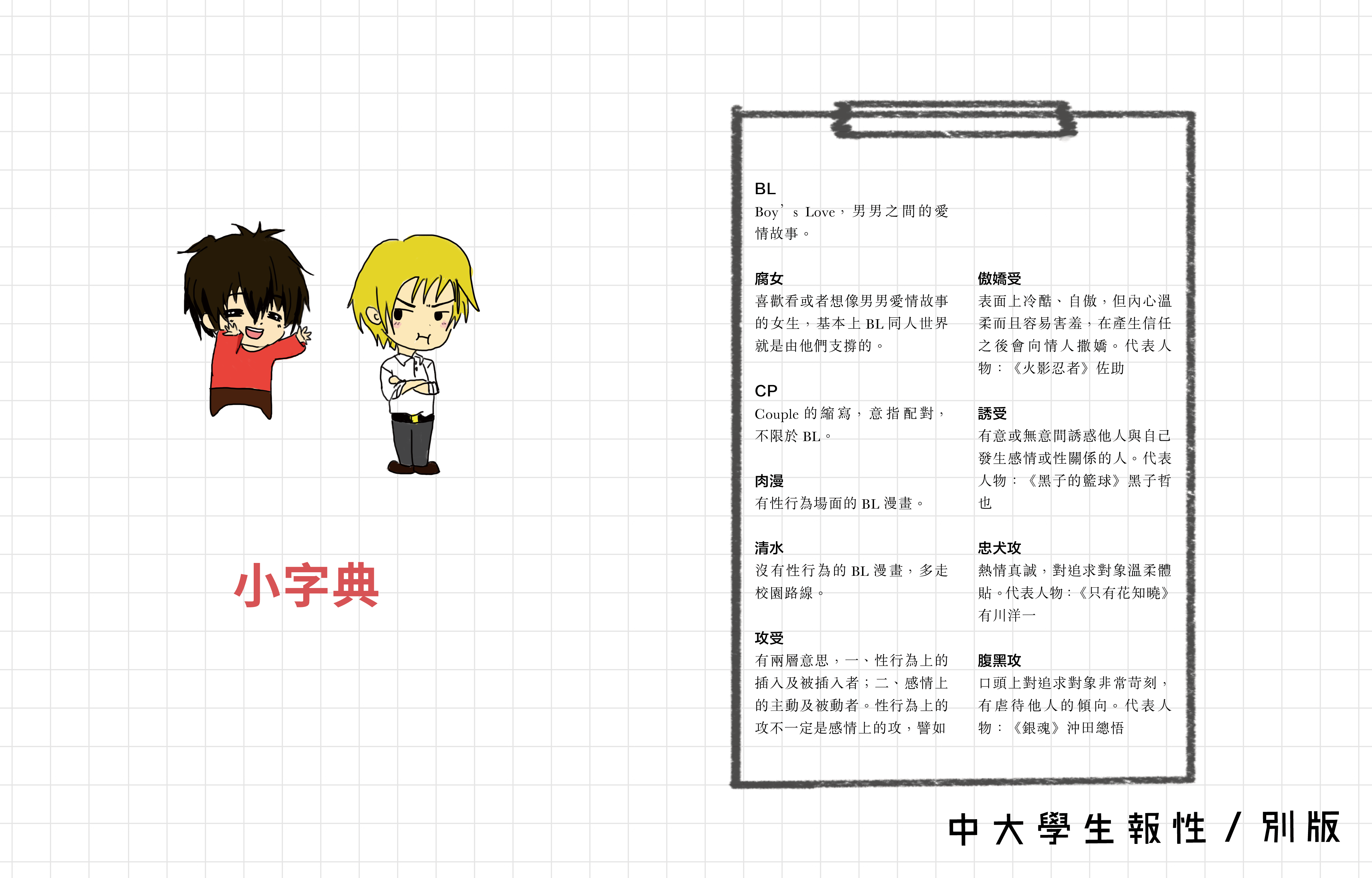 放肆吧,這是姐們的情慾淨土! 17年1月號, 46屆莊「縫」(16-17), 性/別, 性/別 文:穿內褲時要留意毛毛的生長方向哦! 要是女生的人生就是被社會的貞潔觀強姦,BL大概就是我囚籠的窗子。 4時15分,不耐煩地收拾工作,冀盼不要有突發事件。5時15分,在觀塘綫與同樣從工作逃出來的人群搏鬥,擠進地鐵。6時,轉動門匙,把裙子胸圍統統脫下扔在床上,穿上皺皺的睡衣,坐在電腦前,一口氣打開幾個BL漫畫的視窗,頭也不回地開始我的腐女旅程。當我的朋友聞及我喜歡看BL漫,許多也立時大喊「變態!」。吶,為了不上道的大家,我就在這裏說清楚吧。 Act.1:腐女為什麼看BL? 不如先一起看看《四代目.大和辰之》這部BL漫: 以下是BL常見的設定:兩主角的顏值身材衝破表,在BL中你不會看到胖醜的主角。故此,即使是對不好肉的讀者來說,眼睛也保證吃盡冰淇淋。(當然是對主流審美觀的異性戀女讀者而言。) 一般人會以為,BL中的攻就是異性戀中的男方,擁有能力高、主動、力氣大、冷酷等等男性特質;受就是女方,特點是漂亮、溫柔、被動、被保護。要是如此的話,腐女為何不乾脆看少女漫畫?雖然有一部份作品中的受方,基本上改個名字就可以是女主角,但好看的BL,攻受方都應該有男性,甚至女性特質。譬如辰之雖然是陽剛味十足的社團接手人,正宗高富帥,卻多次被望從危難中拯救。望就是一個花瓶般漂亮的少年(小時甚至曾被迫為妓),又是個溫柔的幼稚園老師,氣質雖傾向陰柔,但他絕對不是一個被動被H的小受,他可曾經很有男子氣概地闖入險境,公主式抱走辰之。簡言之,在理想的BL作品,攻不一定就是性格強勢,受不應是黛玉妹再世,而是雙方都有一定的男友力,讓讀者覺得兩位都是可慾的對象。 回到標題上的問題:「你怎麼會喜歡看BL?」 對愛好清水的同學而言,BL除了滿足眼睛的慾望,男生在愛情中別扭的姿態亦帶來另類的享受。但對我而言,最直接的原因是「不過想吃肉唄。」來回想一下,AV或少女漫畫中的床戲大多都把鏡頭一股勁兒zoom近女生的奶子、長腿、害羞的表情,男生要麼看不到樣子,要麼就一股勁兒抽插射精。這種鏡頭可滿足不到女生對男性胴體的慾望啊。反之,女性向的BL作品着力呈現出男色魅力:細心品味,男主角肌肉線條比一般H漫更為細膩,而且出現一些異性向作品沒有的動作,譬如望用手在辰之身上漫游一般塗上潤滑劑,把男性美色放大到極限;多樣的鏡頭角度也展現出男主角豐富的表情:辰之那逃逗性滿滿的舔唇,不是太犯規了嗎?望被挑起性慾後,一副不甘示弱要「操死你」表情也是誘人得發瘋啊! 再者,BL的肉不單純是肉,而是以劇情鋪墊出的肉。當關係交纏,製造出一線懸命的情慾張力,再在觸碰之際爆發!這樣有故事的肉比AV的抽插射精更實在而動人。 因此之故,我不為漫天的AV及H漫所動,卻不得不降於誘人的BL男色下。如果男男愛才能滿足我的女性情慾,扛上腐女之名又如何。 Act.2:腐女是變態嗎? 你也許覺得,BL就是一群好色女的產物,不需要談論。事實是,BL的人氣、腐女的力量已經高得讓日本大型出版社如集英社、角川以及香港的動漫展[1]也要爭奪市場。近年也出現好幾部雄霸動漫界的腐向作品,《黑子的籃球》就是佼佼者。腐女們形成一個龐大的地下軍團。原因單純是我們變態嗎?不,變態的是社會! 各種社會規訓令女性不能表達性慾,譬如法律假定16歲以下少女沒有性慾;學校性教育教我們說「不要」,卻隻字不提女性如何去「要」;台灣電影中的女生也是夠純潔天真才吸引男主角。簡的來說,女生就得純潔無邪。 你他媽的!為甚麼我就得活得那麼別扭?為甚麼我哥可以大刺刺的討論看到誰會扯旗,我說「鈴木一徹做愛的表情好棒棒」就是變態? 貞潔牌坊壓在女性頭上,令我們的慾望得不到解放。再者,就算你能打破社會定見,工作、課業reading已經把人的精神心力抽乾了。誰能在一天工作之後仍能精神奕奕地找SP、找打炮場地(還要格價),而最後能全情投入地享受性愛而不是15分鐘匆匆了事?當年輕人隨時死在無間工時、工作壓力[2]手上,憑誰也有心無力吧? 完結篇:我絕對會保持一顆不純潔的心! 回想中二時,在同學慫恿下看了第一篇BL,從此打開了開關。從前還會指責看BL的同學「大變態!女孩子不可以這麼色!」現在,當自己蹣跚地走上社會人士的道路,免不成輪到我被同學嘲笑是大色狼,幸運的是我還能瞇着眼笑說「你要讓我開發一下嗎?」BL就是生活中喘息的空間,慾望的抒發。社會對我們的純潔訓練不是夠了嗎?當模範乖乖也實在太無聊了,何不忠於自己的慾望,傲然地說「我就是不純潔!」 [1]香港動漫電玩節在2014年開始舉行創天綜合同人祭,明顯覷覦腐女的強大消費力。 [2]慘劇太多,只枚舉兩例:本年五一勞動節,從事採購的香港女生胡家怡(26歲)因工作壓力而出現身心問題離世;去年聖誕節,受聘於日本大型廣告公司的東大畢業生高橋茉莉(24歲)被東京勞動局判定為過勞死。 分享至: Leave a Reply Cancel Reply Your email address will not be published.CommentName* Email* Website 在瀏覽器中儲存顯示名稱、電子郵件地址及個人網站網址,以供下次發佈留言時使用。 6 × = 54 Δ