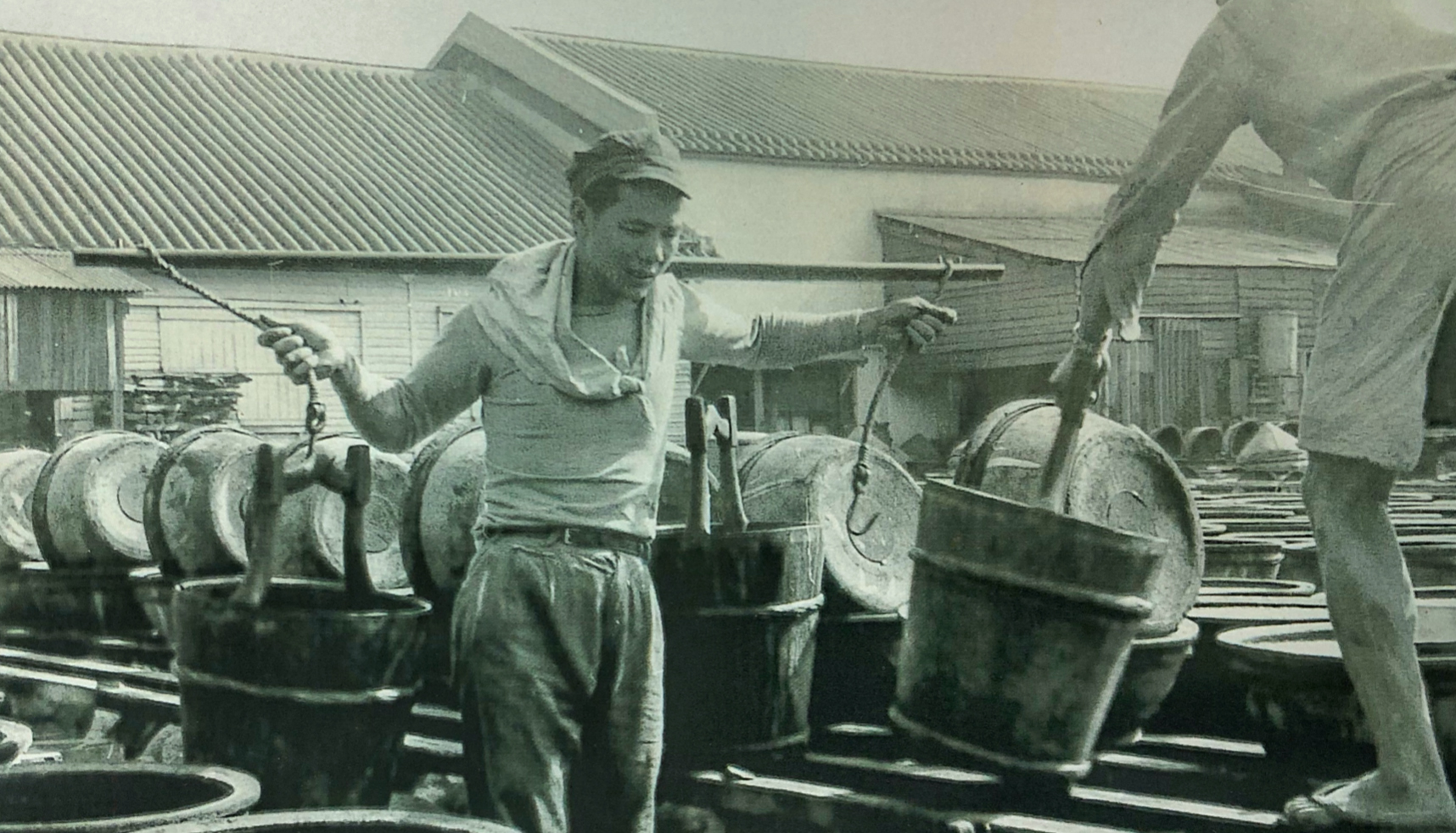 冠珍醬園廠房最初位於九龍城九龍大街,工人們逐擔逐擔挑黃豆入瓦缸。(受訪者提供)