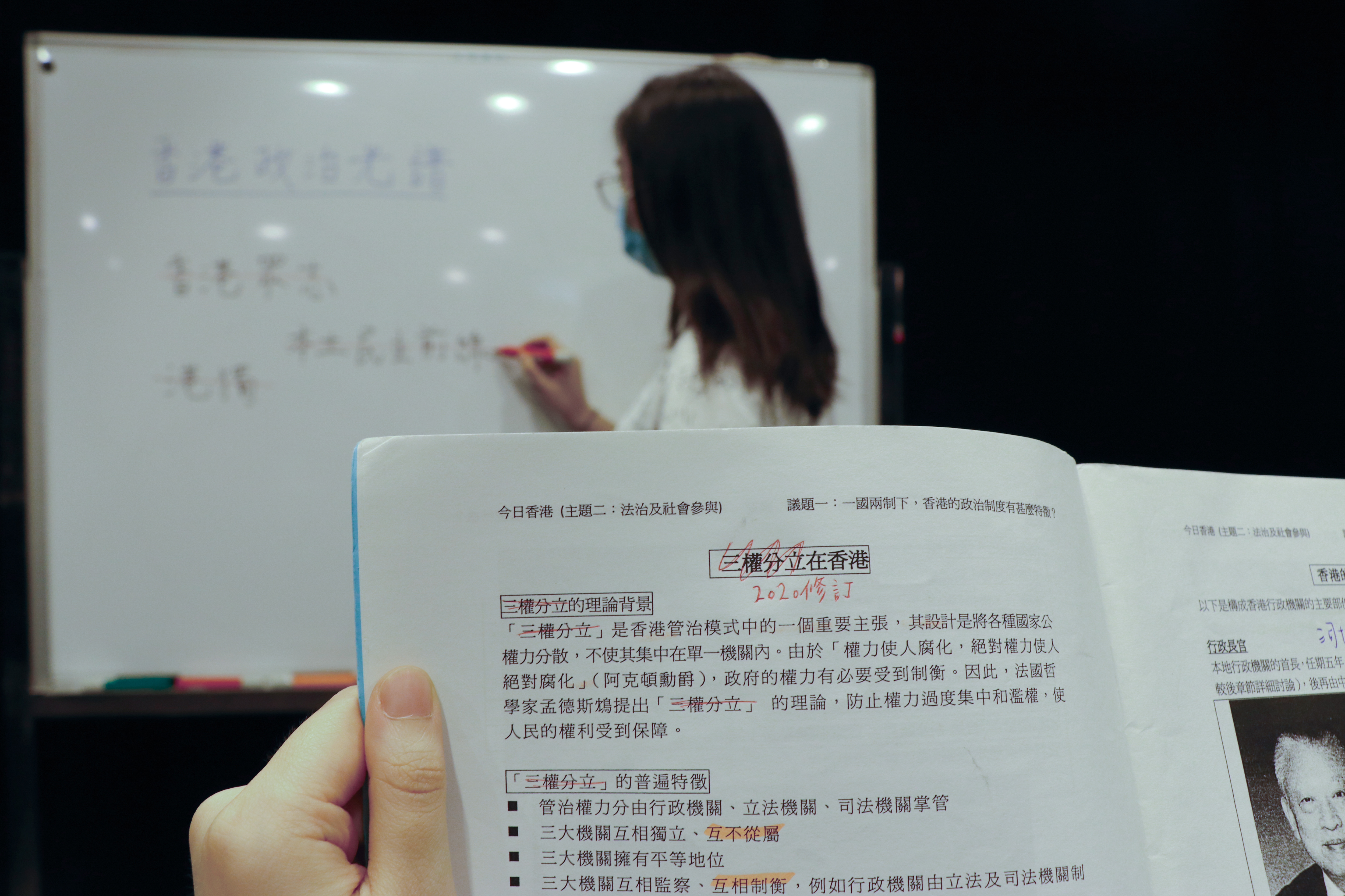 就算不是政治議題,他教學時亦要打醒十二分精神,例如能源科技單元裏的中國環境污染議題,他會選擇援引數據陳述客觀事實,例如污染問題有多嚴重,而污染背後的原因,以及政府施政,他則會輕輕帶過,點到即止,「安全起見,所有牽涉批評政府、對社會有負面影響,但沒有客觀證據的二手資料,一律少用」。