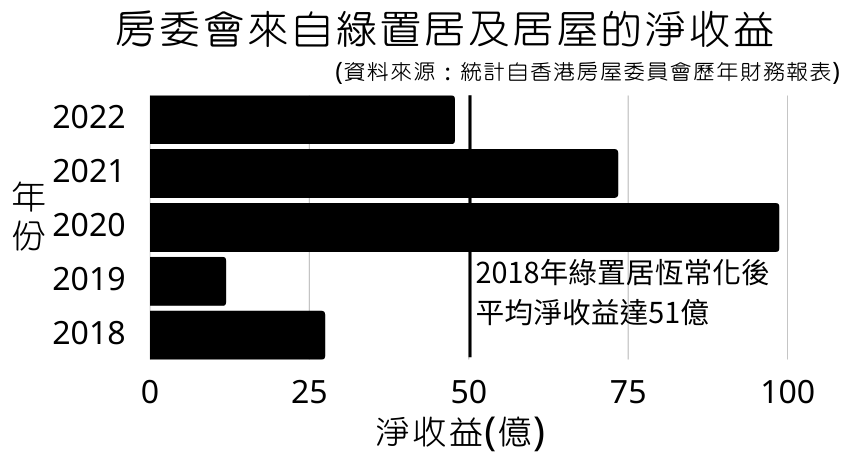 房屋委員會雖然是「公營機構」,卻是須為自己的財政自負盈虧的部門,那麼利用市場邏輯來營利成為了房委會營運不可或缺的宗旨,建成公屋就不單純是以民生作考量,也是賺錢的手段。其手中所掌握的「公營房屋」,在2018年後透過「綠置居」[8]恆常化成為可套現的資產,房委會的主要收益,居屋和綠置居的平均每年純收益達51億[9]。居屋的定價在某程度上和市價掛勾,加上自負盈虧的營利邏輯,房委會自然成為了高樓價的既得利益者之一。