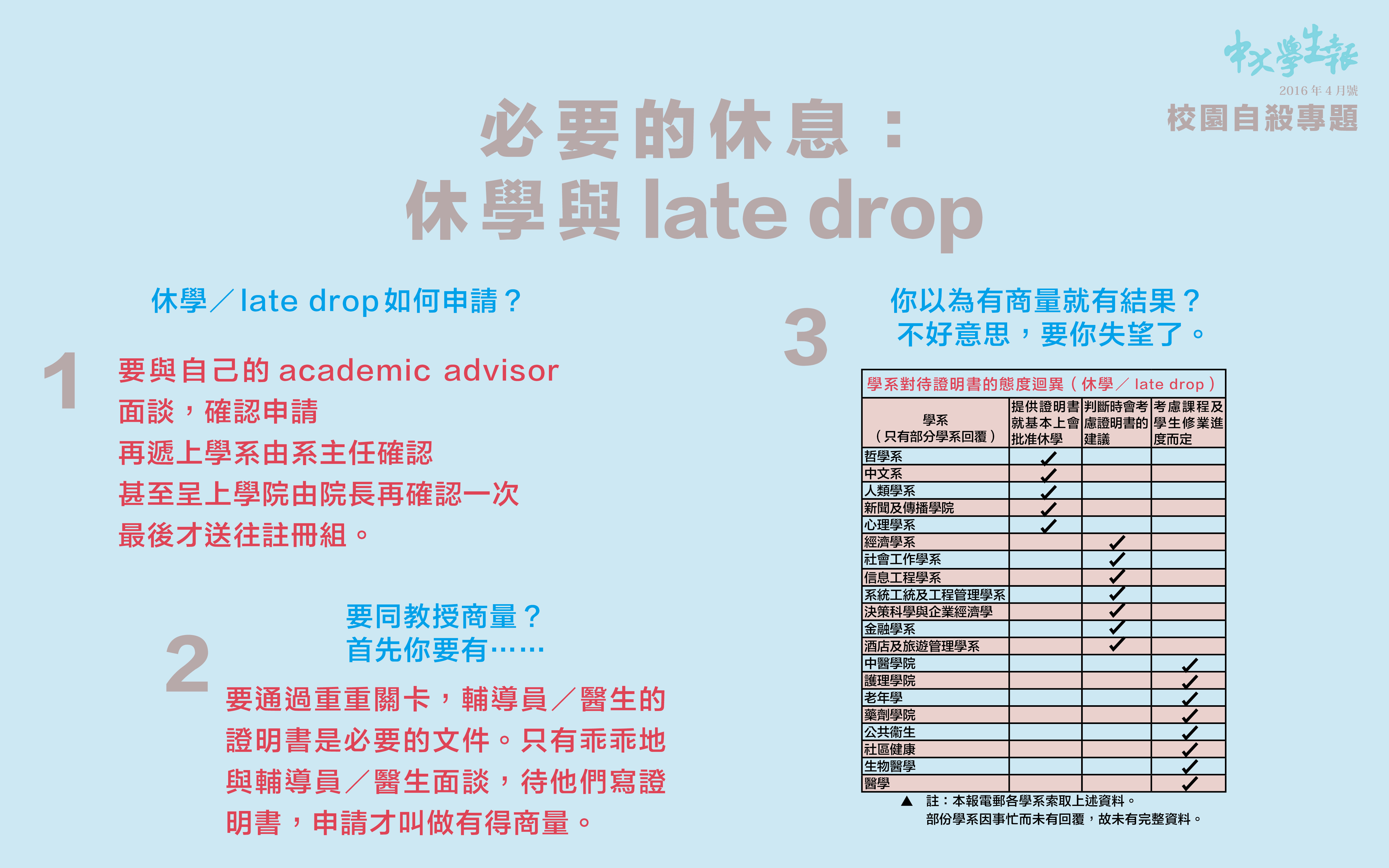 Home校園必要的休息:休學與late drop 校園, 16年4月號, 46屆莊「縫」(16-17) 文:申請人 當一個人面對情緒問題,同時又要處理洶湧而至的工作,往往是致命的狀態:試想像一位大學生與家人鬧翻,一回家就與父母吵架,有家歸不得,grant&loan手續又搞到一頭煙,學業成績又一直都追不上。心情自然陷入低谷,甚至對很多事情也提不起勁/混亂不堪,但仍然要如常的上課、做paper和考試。當然他們可以走堂,但堂走多了,出席率不足,還是會不及格,遑論走的是paper,考試。為合格,他們只好硬著頭皮繼續上課。情況就如感冒以後,非但不能靜養,還要持續工作一樣。假如學業壓力正是造成情緒問題的元兇之一,繼續上課只會病多幾錢重。 展開休學/late drop之旅 在這情況之下,他們需要的是一段休息的時間,讓自己脫離繁重的學習,然後專心處理問題,最起碼不用強逼自己上課,少一個壓力的來源。休學與late drop正是首選的方法。休學如何申請?你先要從註冊組的網頁上列印申請表,填上個人資料,選擇要休的學期,再到不同部門蓋章。至於late drop就要自己問該學科的導師。這樣看似容易,但實際上並不簡單。先要與自己的academic adviser面談,由他確認你的申請,然後再遞上學系由系主任確認,甚至呈上學院由院長再確認一次,最後才送往註冊組蓋章。要通過重重關卡,輔導員/醫生的證明書是必要的文件。只有乖乖地與輔導員/醫生面談,待他們按照你的心理狀況去寫一封證明書,休學/late drop的申請才叫做有得商量。若然沒有,任你在城闕大吵大鬧,要生要死,城門依舊緊閉無誤。 不簡單的旅程 你以為有商量就有結果?不好意思,要你失望了。事關不同學系看待證明書的態度迴異: 一、提供證明書就基本上會批准休學; 二、判斷時會考慮證明書的建議; 三、提供證明書後仍要與學生商討,再考慮課程 及學生修業進度而定(請參考圖表)。 由此可見,證明書之於休學的力量,不如醫生紙之於病假般有效。 當然休學與late drop事關重大,特別是醫學院學生的成績大多要呈上專職組織如護士管理局作記錄,有些學系的課程繁重複雜,又牽涉實習等事宜,不能一概而論,所以慎重處理亦是情有可願。不過,同學的心理狀態就不可以讓我們撇開這些考慮嗎?要知道,這些行政上的手續絕對不是一位情緒面臨崩潰的同學可以處理。既然連輔導員和醫生都已經出信證明同學不適合繼續修學,強留學生也是無補於事,又何必呢? 態度迴異不在話下,最詭異的是取得證明書的過程。據有經驗的同學C指出過程可以十分繁複。同學要向輔導員索取證明書,先要經歷一段長時間的心理評估。譬如C是由於與家人鬧翻,再加上身體的不適,而陷入崩潰狀態,所以輔導員要接觸他的家人。他固然不情願再面對父母,見輔導員之事因而不了了之。之後,他去找學系,學系卻叫他找註冊組,註冊組叫他找保健處,保健處叫他再問清楚學系。最後,他兜兜轉轉被轉介到校外的精神科醫生[1],一共見了五次,花了五千診費[2],才得到證明書。在他的說法中,與輔導員/醫生的見面其實沒有治療之效,只為得到證明書,但單是看醫生就花了兩個月時間。多番周旋之下,C前後用了近一個學期的時間才獲得休學批准,但學期已經將近尾聲,又要面對下個學期。他根本沒有休息過,只好再申請下學期休學。 休學/late drop的程序本身就已經十分複雜。想不到,最關鍵的一步更是麻煩。或許,我們應該反思一下:若然這些制度想讓同學休息一下,專心處理困擾自己的事情,指引就應該清晰一點,輕鬆一點。雖然這些繁複程序本意是剔除混水摸魚的同學,但現在卻令原本有需要休學的同學也無所適從,豈不是本末倒置? 請給我一段休息的時間 如果休學有清晰的規則,效果已經可以好好。例如羅列要準備的文件,指明取得文件的途徑,同時減少步驟和時間,列明整個流程。此後,如果學系要保留部份與同學商討的空間,同學也起碼可以有規可依。當然休學的確牽連甚大,要謹慎處理也無可厚非,但起碼late drop可以多一點彈性。參考其他大學如城大、理大的late drop,程序上只要該課程的主任確認即可。反觀中大,沒有證明書就免談。很多要late drop的同學其實未嚴重到可以提供證明,但他們也需要多一點時間處理情緒。如果late drop可以簡單一點,例如證明書不再是必要文件,他們就輕鬆多了。 這些未能提供證明書但情緒不穩的個案大有人在。如果late drop可以簡化,固然是援助之一。然而,沒有證明書,是否就不需要休學呢?我們不得而知,但至少現在不能。 [1] 現在保健處終於開始招聘精神科醫生。 [2] 校方提供五次全額津貼,即見第六次要自費。 〈中大輔導二三事〉 〈必要的休息:休學與late drop〉 校園自殺專題——徵稿前言 來稿:或許你即使走,都可以帶著更多愛 來稿:未來的主人翁 來稿:我們都一樣 來稿:我為甚麼不開心 校園自殺專題——徵稿後感 〈哀痛之難〉 分享至: Leave a Reply Cancel ReplyYour email address will not be published.CommentName* Email* Website 在瀏覽器中儲存顯示名稱、電子郵件地址及個人網站網址,以供下次發佈留言時使用。 3 + = 九 Δ