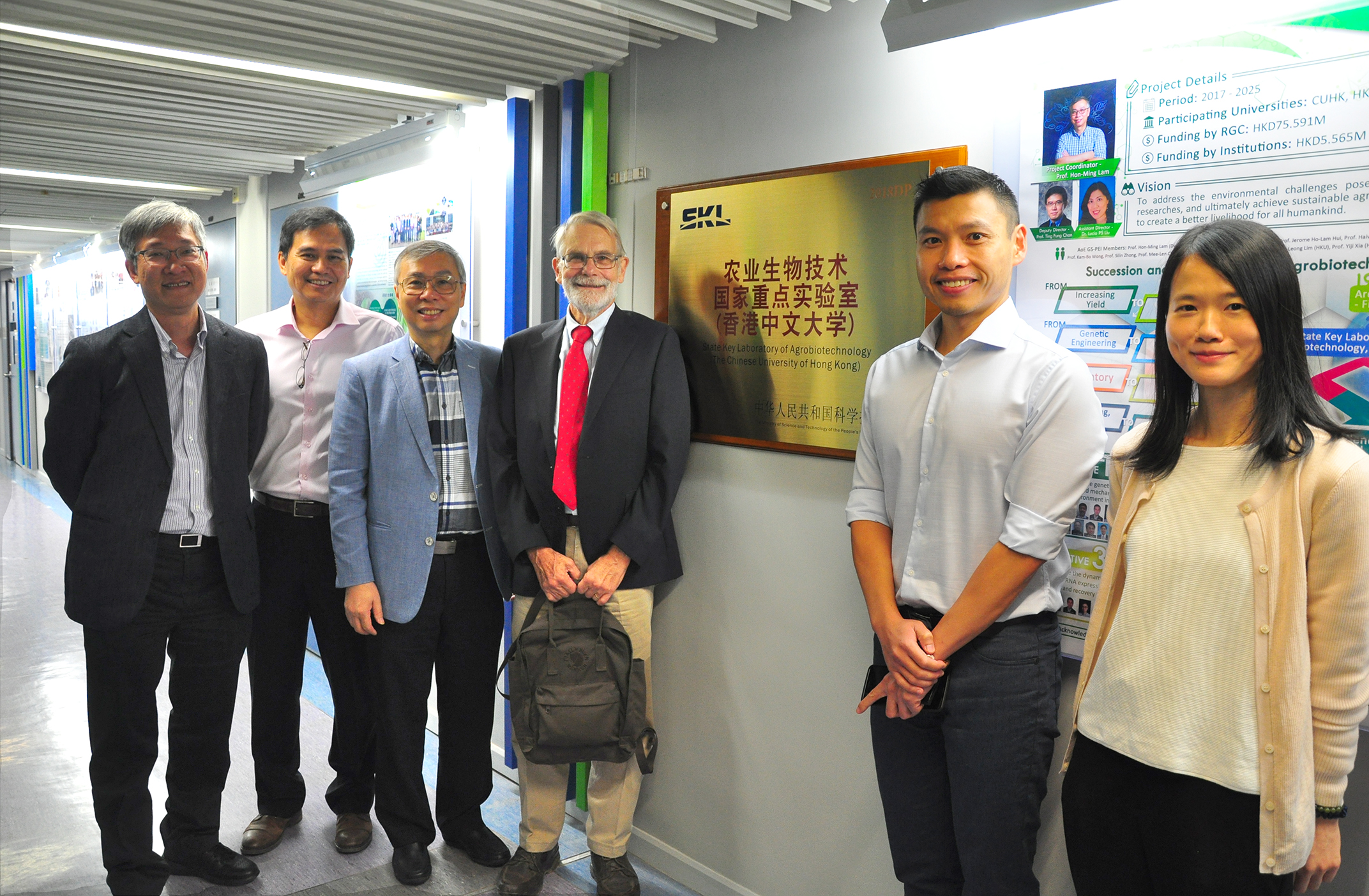 Prof. Frederick Menis (4th from left), Senior Group Leader (Emeritus), Friedrich-Miescher Institute for Biomedical Research and Professor Emeritus for Plant Developmental Biology, University of Basel visited the State Key Laboratory of Agrobiotechnology (CUHK). From Left: Prof. KB Wong, Prof. SM Ngai, Prof. HM Lam (Director of SKLA), Prof. Frederick Menis, Prof. Danny WK Ng, Prof. XH Zhuang
