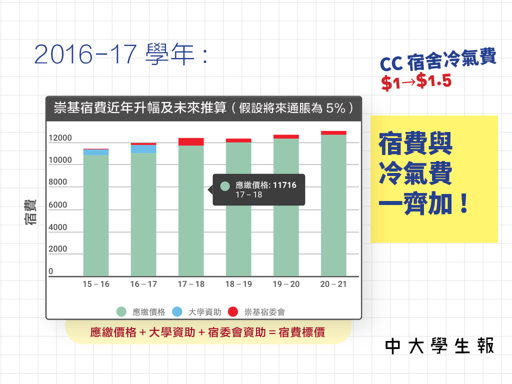 2017-18年度崇基學院的宿費將繼續跟隨通脹(3.82%)上升,由於屆時校方所提供的凍結宿費資助經已完結,學生承受的宿費加幅將高達6.12%,升幅達$700($11040→$11716)。除此之外,去年九月學生宿舍的冷氣費由$1升至$1.5。面對宿費和冷氣費的雙重加幅,同學的負擔必定加重。