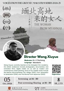 紀錄片《緬北高地來的女人》及導演影後談 紀錄片《緬北高地來的女人》及導演影後談 日期:10月5日,星期六放映:2:30 p.m. | 片長:106 分鐘映後談:4:30 p.m. - 5:15 p.m. 講者:王秀岳導演主持:李鐵成博士,文化及宗教研究系講師語言:普通話 故事簡介:Larry出生在緬北山區,小時候上山砍柴摔斷了腿,沒錢醫治,落下殘疾。在十五六歲的時候,跟隨姨媽到了中國北方,嫁給了一個比她大很多的男人曹海江。和曹海江過了十幾年,生了兩個孩子,期間拉瑞離家出走,和一個年輕男子結婚生了一個女孩。夏天到了,拉瑞回到緬北老家。導演闡述:一個貧困的緬甸女人,三段跨越國境線的婚姻,生了四個孩子,在追求幸福生活的過程中走上了一條人生不歸路。本片跟隨著Larry從中國山東到緬北老家,講述了一個外來媳婦別樣的人生經歷及其家庭故事! 導演簡介: 王秀岳,導演,攝影師。現工作生活在上海,任教於上海大學上海電影學院。藝術活動涉及紀錄片與動畫創作、現當代架上繪畫等。主要作品:紀錄長片《別墅村民》(2010),動畫紀錄短片《城市村民》(2012)《生生不息》(2018年),《緬北高地來的女人》(2022)等。 報名:https://cloud.itsc.cuhk.edu.hk/mycuform/view.php?id=2669992 查詢:zhuoyueli@cuhk.edu.hk Screening of ‘The Woman…