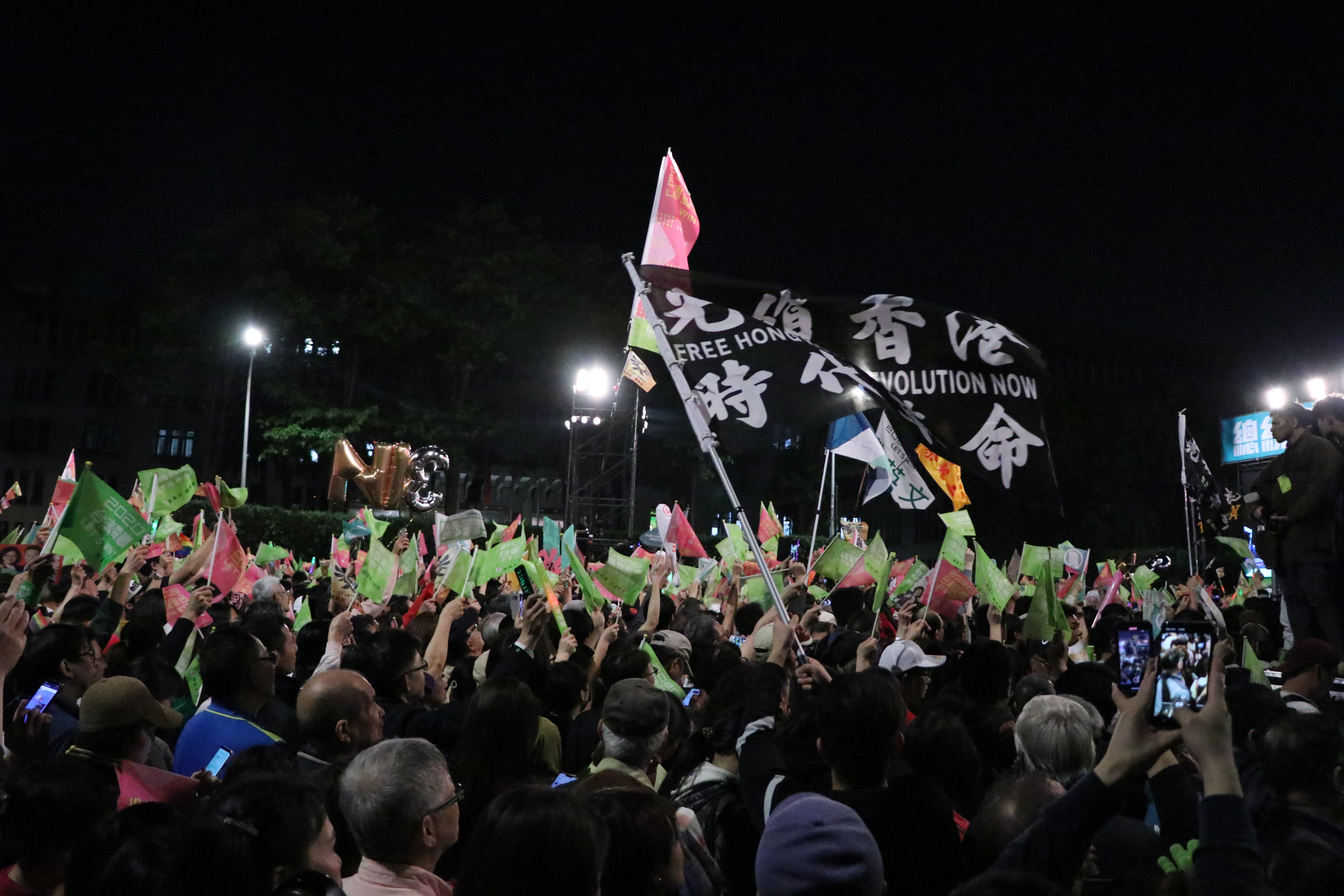 投票前夕,蔡英文總統在台北凱達格蘭大道舉行壓軸造勢晚會,逾50萬人參加,當中不乏香港人的身影,有人揮舞寫上「光復香港 · 時代革命」的黑旗。蔡英文致辭時,特別提到香港,稱香港的年輕人也在關注這場選舉結果。台北與香港相隔800多公里,但連月以來的反修例示威,將兩地的人與事連接在一起。