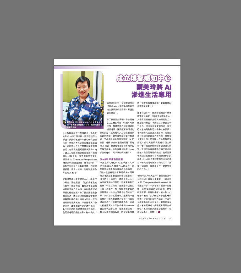 CPII is pleased to announce that the interview of our Centre Director, Professor Helen Meng has been published in the Chinese University Alumni Magazine Issue 113, p.25. In the interview, Professor Helen Meng shared her newest innovations, including Speech and Language Analytics Toolkit, and expressed her thoughts on the impacts of AI development. She hopes that CPII can help to realise the promise of AI and leverage Hong Kong’s international research networks for AI talent development and exchange. She believes that The Chinese University of Hong Kong, as a comprehensive university, can strengthen the research and development in Hong Kong and the Greater Bay Area.