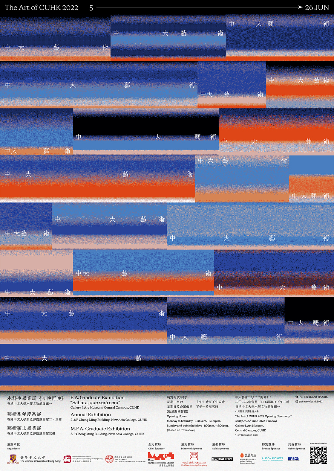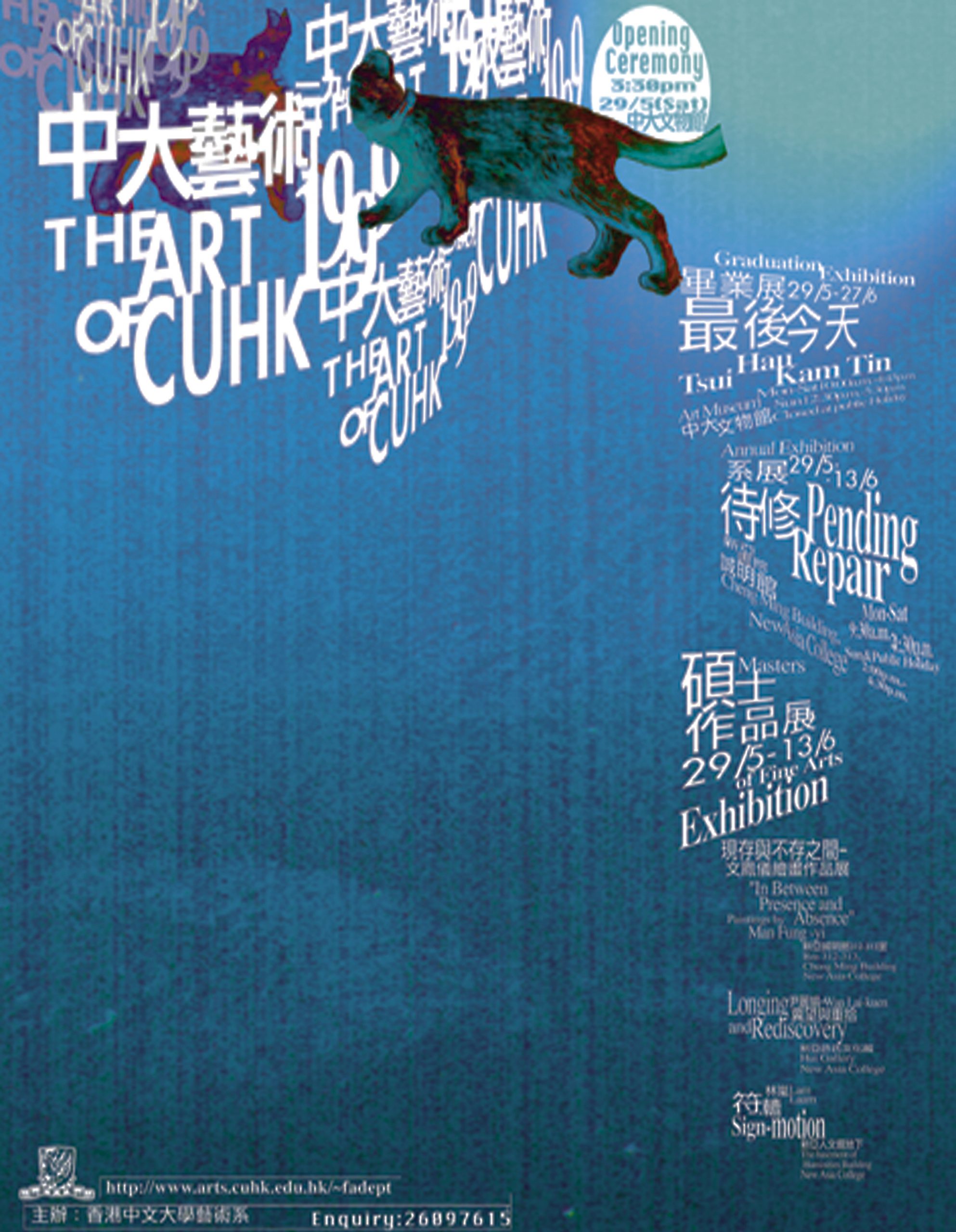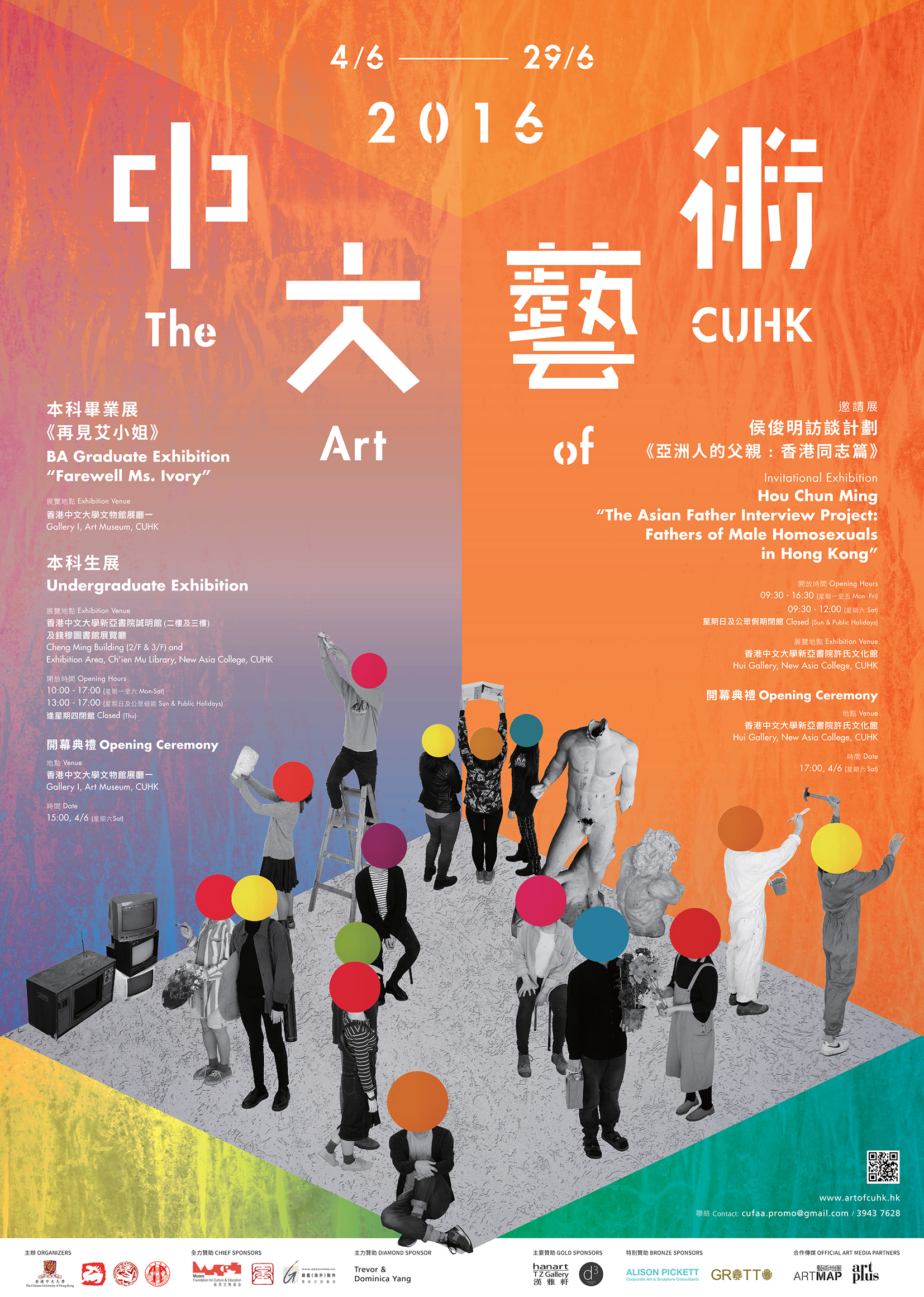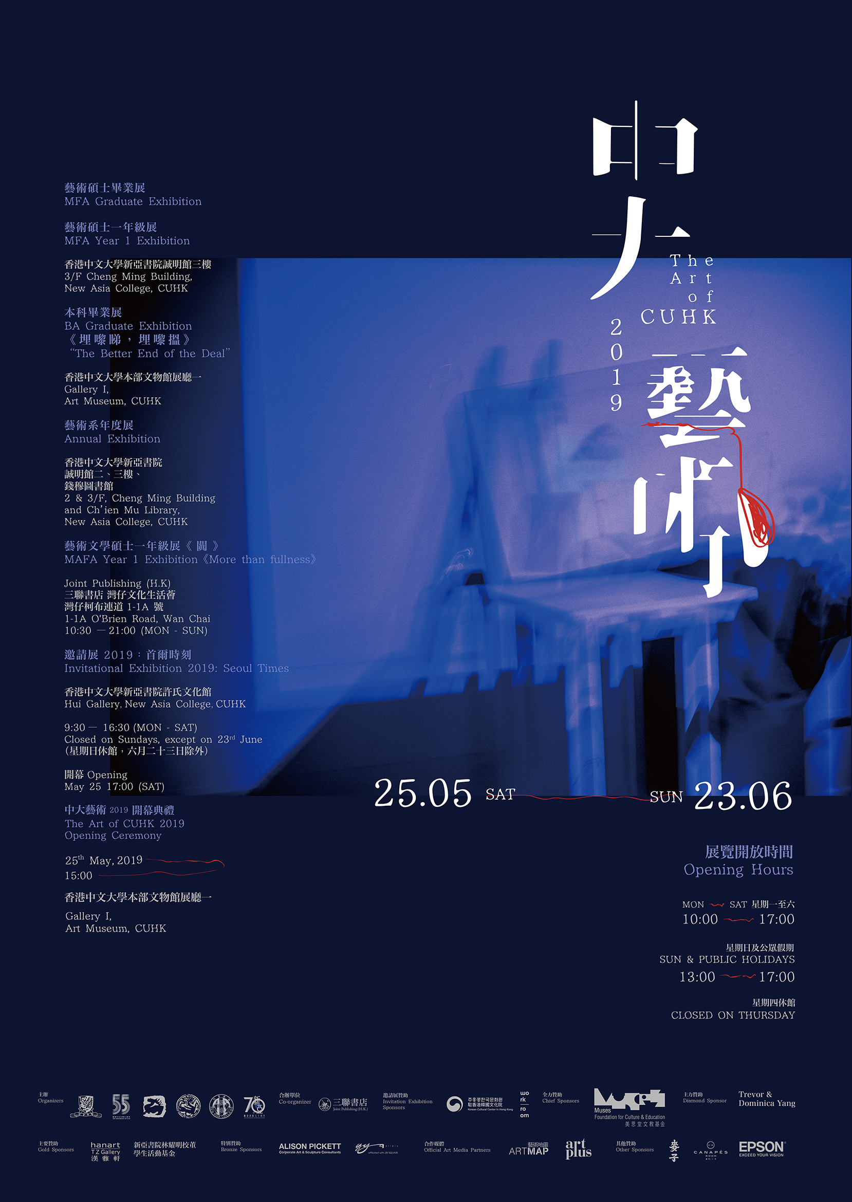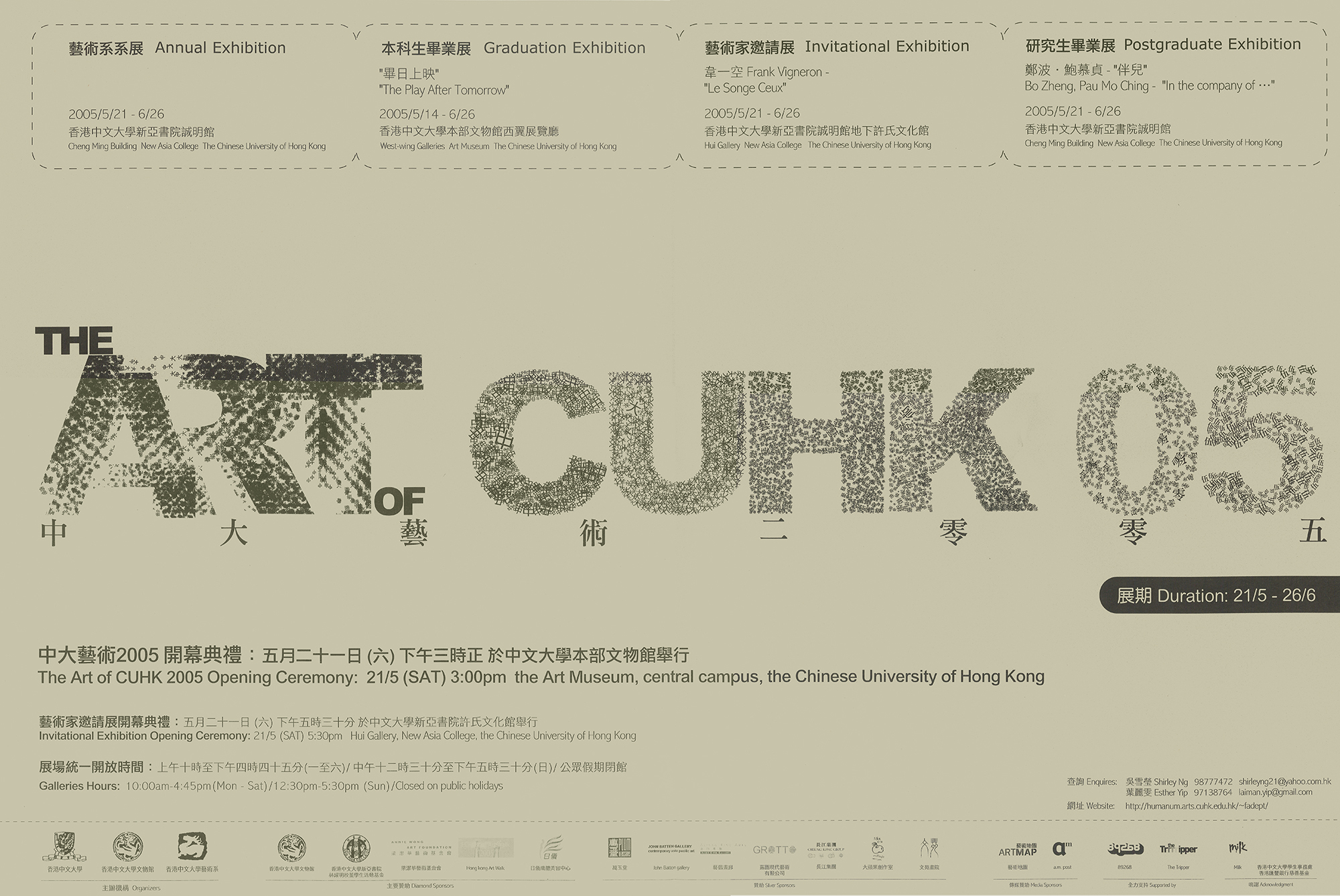 “The Art of CUHK” offers successional exhibitions in two parts since 2013. Part I includes BA Graduation Exhibition, Master of Fine Arts Exhibition, Annual Exhibition & Invitational Exhibition which run from May to June; Part II includes Master of Arts in Fine Arts Graduation Exhibition scheduled for July. The venues of the exhibitions are at the Art Museum, Cheng Ming Building and the Hui Gallery, New Asia College, CUHK.