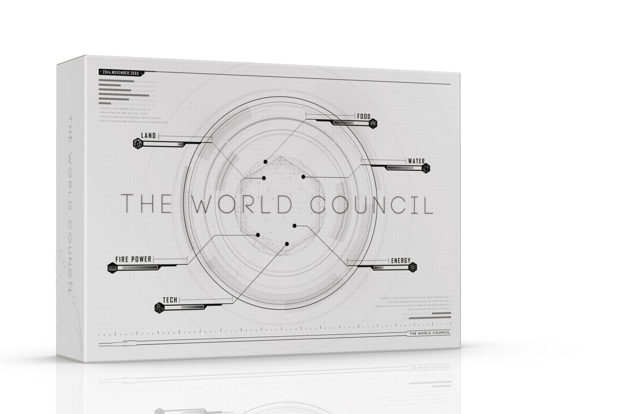 The strategic game accommodates three to eight players representing different types of countries. The aim is to achieve their country’s objectives before “Doomsday” comes. At the start of each game, every player draws a country card which determines their power, objectives and resources. During the game, players can use action cards to issue economic sanctions, launch propaganda wars or other tactics. With building cards, they can construct buildings at the expense of the resources their countries are endowed with. As the players get closer to their objectives, a doomsday index increases. When it reaches its 15-point limit, the game ends.