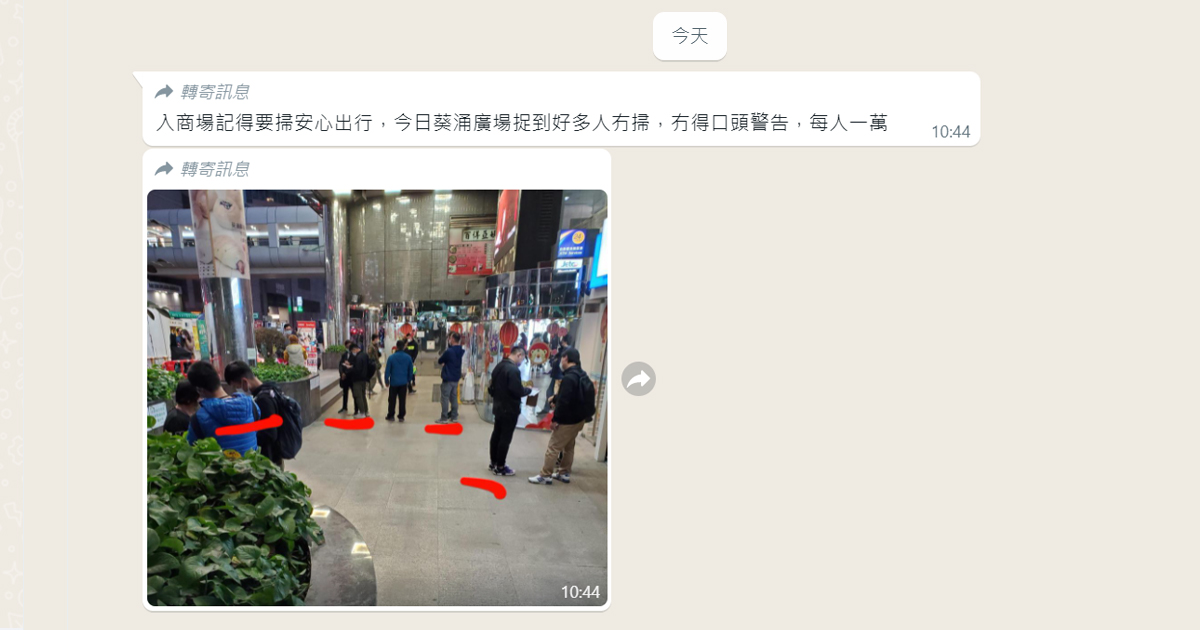 2月12日早上,在WhatsApp收到長輩傳來一則信息:「入商場記得要掃安心出行,今日葵涌廣場捉到好多人冇掃,冇得口頭警告,每人一萬」。不久,再有其他人傳來相同訊息,而社交媒體又流傳進入商場已經要掃安心出行,一時間,流言滿天飛。