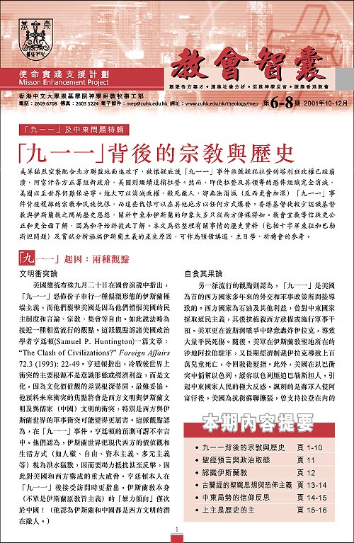 | | 第6期 「九一一」背后的宗教与歴史/圣经预言与政治取态 认识伊斯兰教/古可兰经的「圣战」思想与恐怖主义 中东局势的信仰反思/上主是歴史的主 |