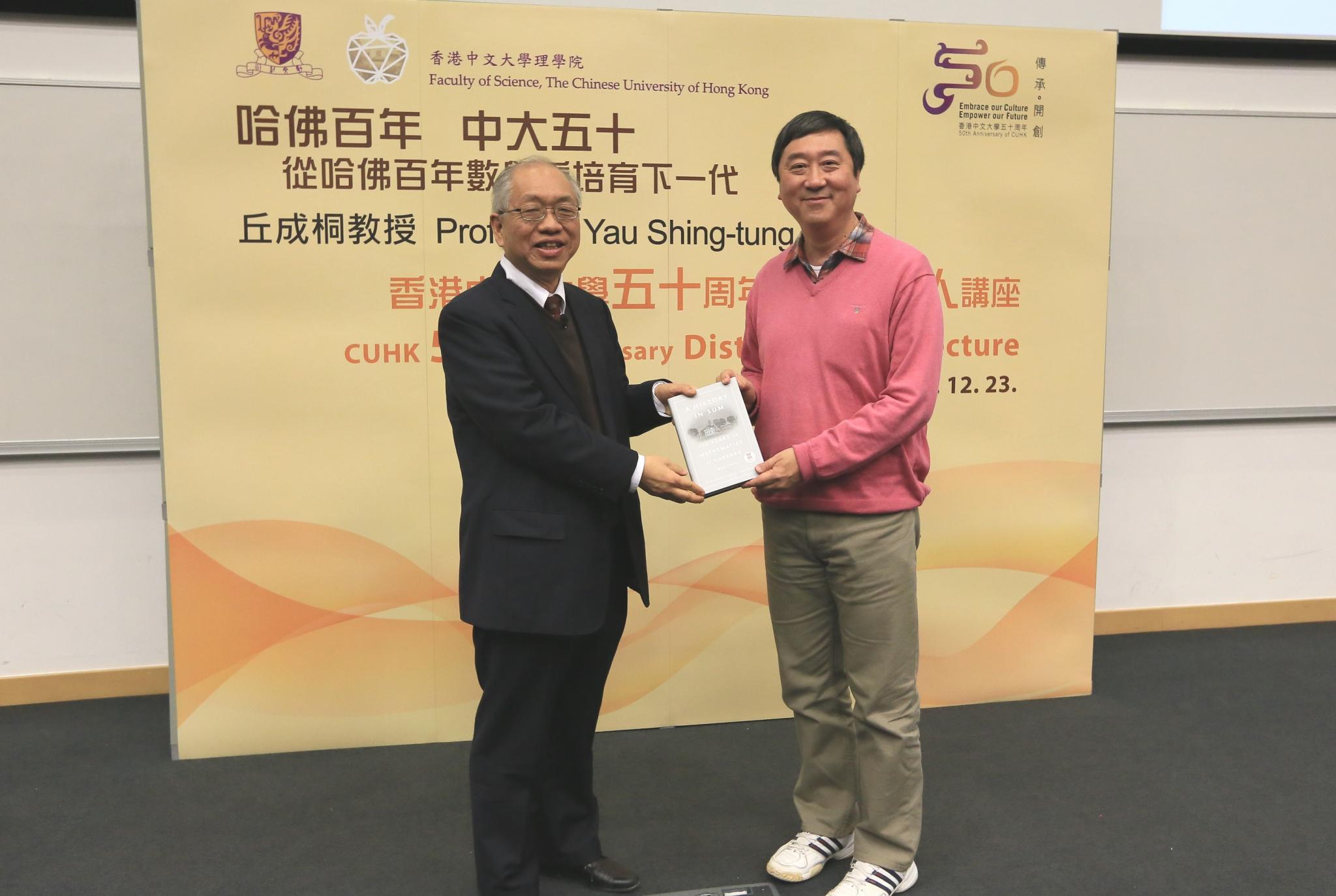 世界知名數學大師丘成桐教授應邀主講中大五十周年傑出學人講座,於十二月二十三日以「哈佛百年,中大五十:從哈佛百年數學看培育下一代」為題,講解哈佛大學數學系的歷史,和他對數學教育的理念,吸引了數百名學者、學生、校友及公眾人士出席,場面熱鬧。