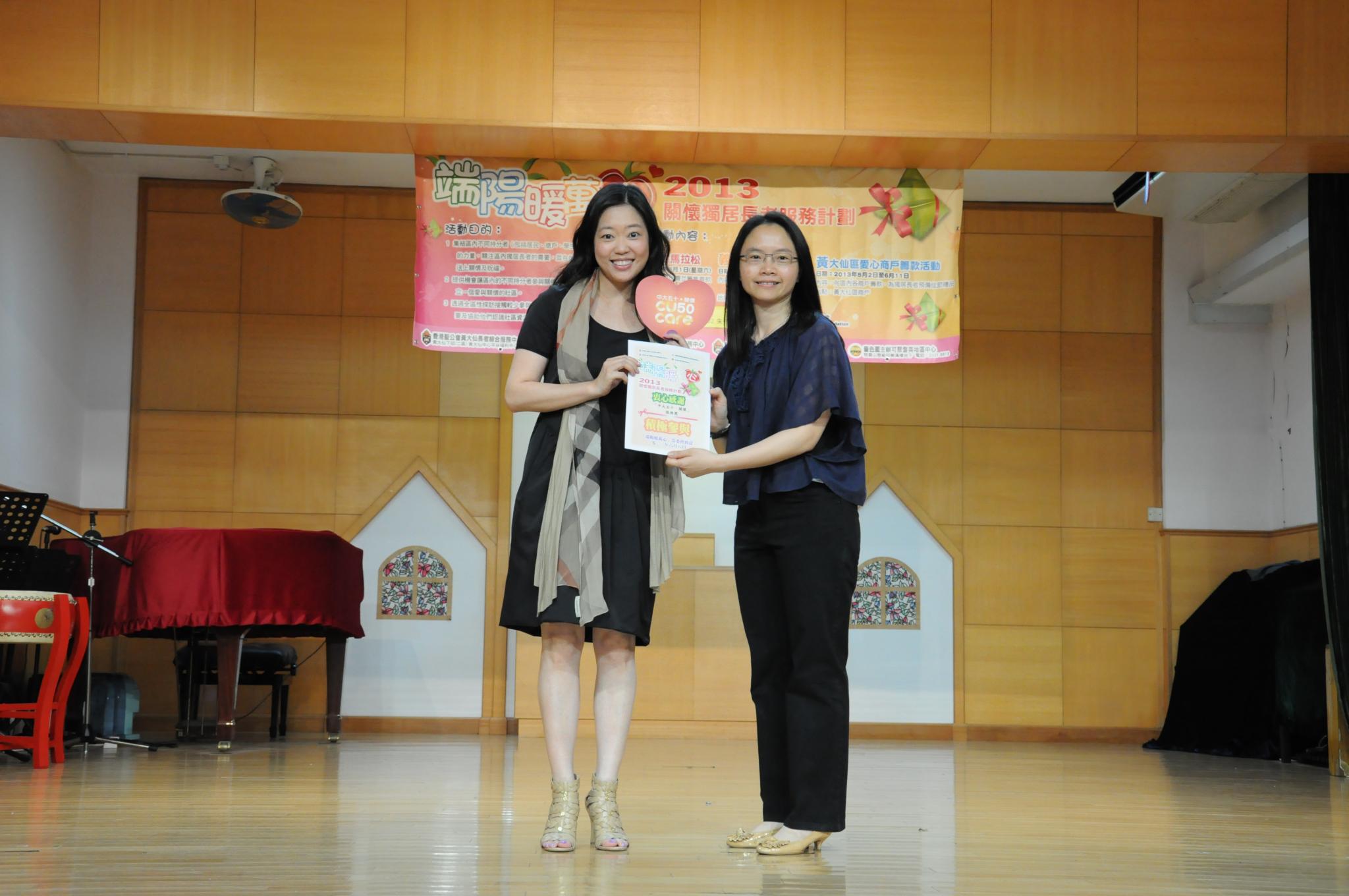 日期: 六月八日 时间: 下午一时三十分至五时三十分 地点: 黄大仙 内容: 中大40名义工响应「中大五十• 关怀」大行动,趁端午前夕参与循道卫理杨震彩虹长者综合服务中心举办的「端阳暖万心- 关怀长者服务计划2013」,为居住于黄大仙区的独居长者送上应节粽子及礼物包,并向他们表达关怀和慰问。中大希望透过各类型的义工服务,鼓励更多中大人关注弱势社群的需要,更可自发以不同方式回馈社区。 相片清单: EN 繁