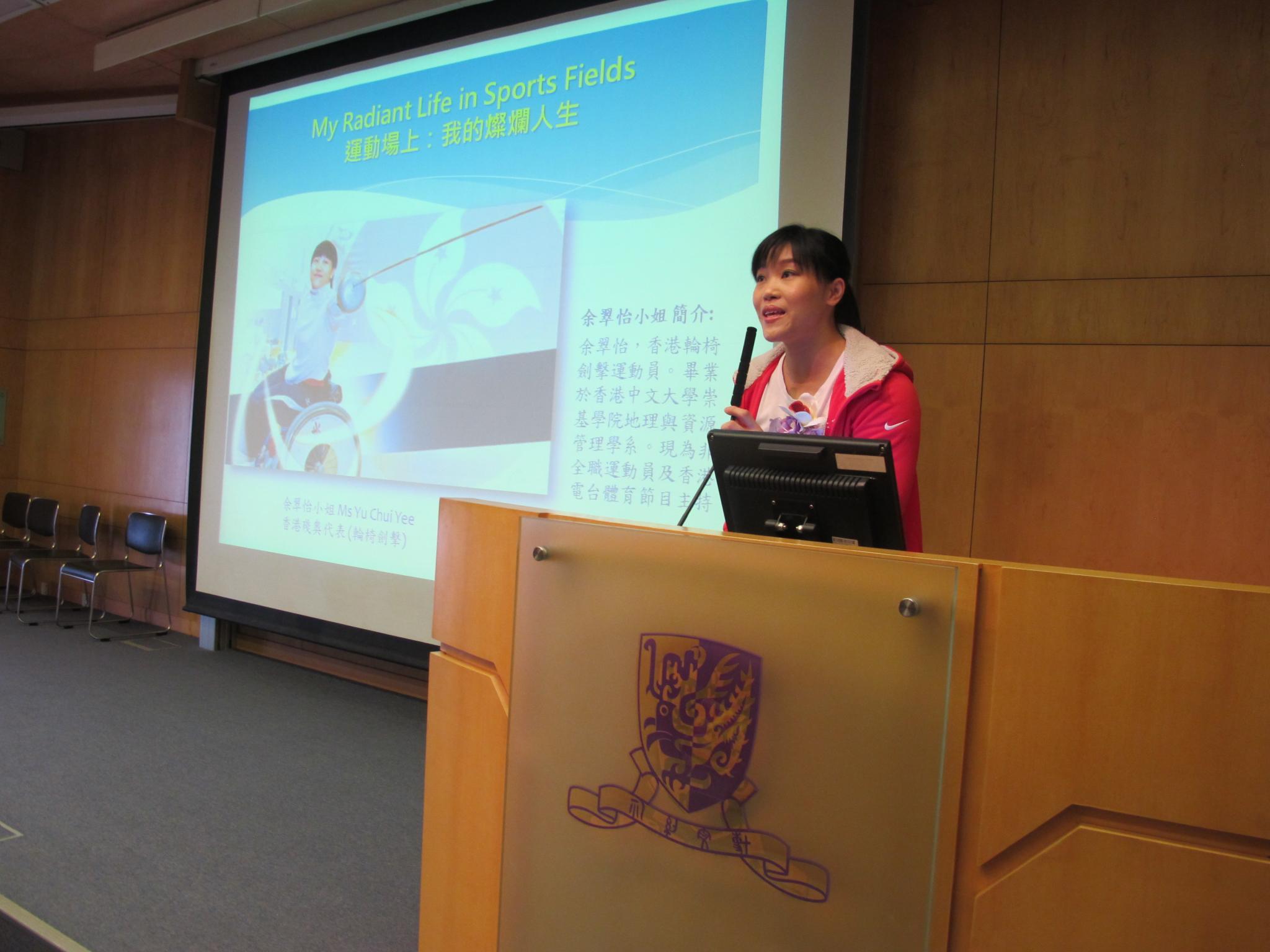 三位來自劍擊、三項鐵人及武術精英體育項目的頂尖運動員,於2013年3月23日在中文大學的五十周年公開講座,以「運動場上:我的燦爛人生」為題,與現場200多位觀眾分享他們過去十多年運動員生涯的甘苦,包括接受高強度訓練的情況,在比賽中拚搏奮進、掙扎求勝的堅持及落敗後的心理調整等等。