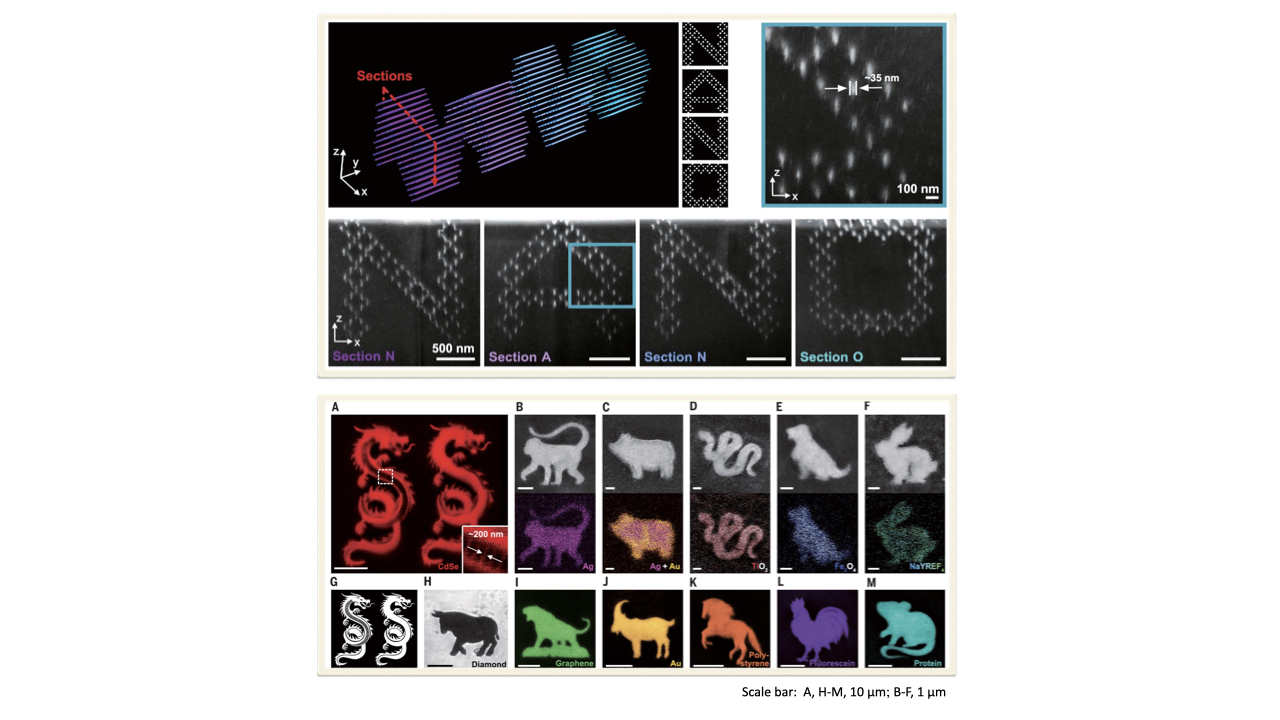 飛秒投影納米列印機是一部破紀錄的多材料納米製造平臺,可列印出以 30 nm (納米)為單位的超過20種3D 結構產品(包括金屬、合金、氧化物、鹽、半導體、聚合物、晶體、染料、生物材料等)。