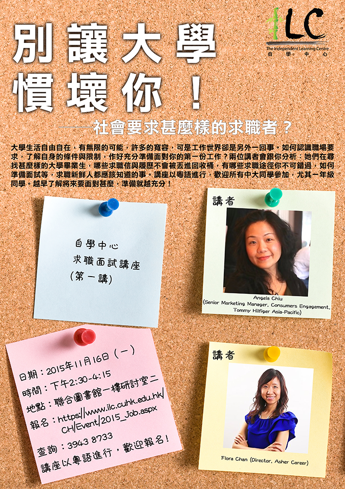 November 2015 別讓大學慣壞你﹗社會要求甚麼樣的求職者? Speaker: Ms. Angela Chiu, Ms. Flora Chan