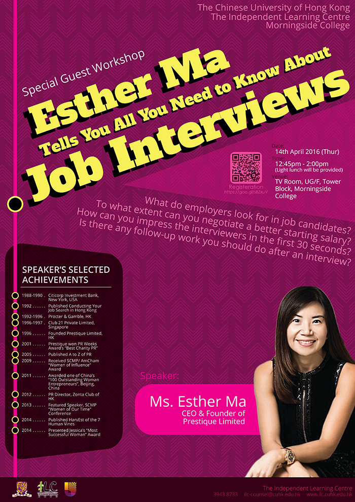 April 2016 Esther Ma tells you all you need to know about Job Interviews Speaker: Ms. Esther Ma
