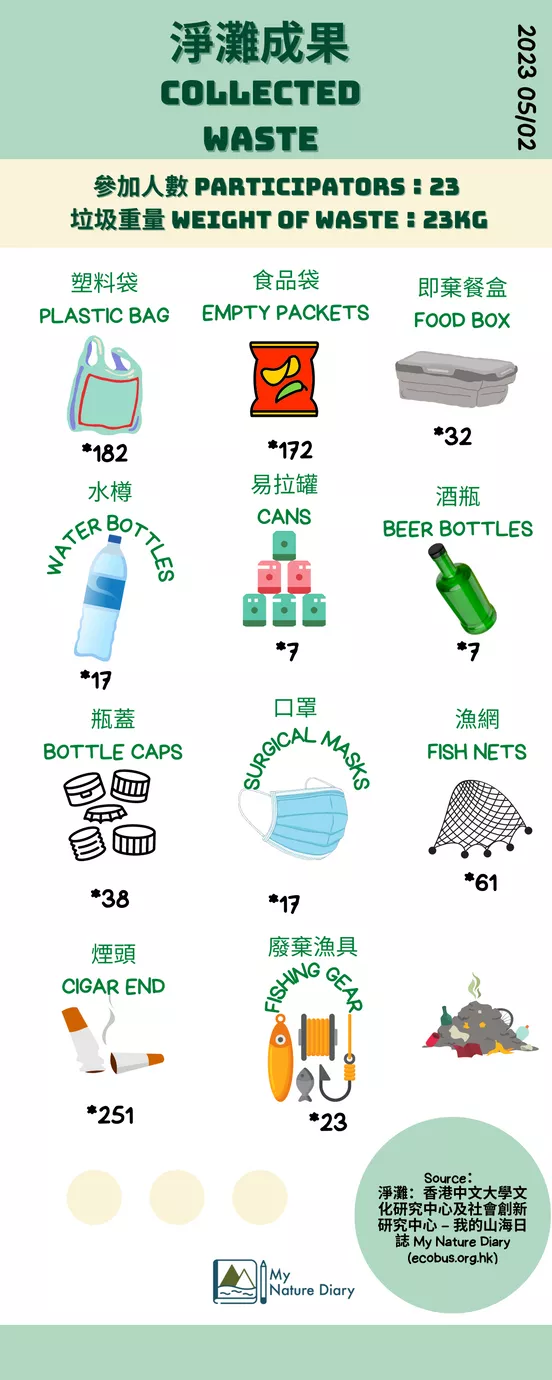 Results collected in the clean-up were recorded by ‘My Nature Diary’ project. ‘My Nature Diary’ combines beach / mountain cleanup, citizen science and environmental education. Through every cleanup event, participants can learn about the concrete issues of marine and mountain debris. The project was initiated by students of the Master of Science in Environmental Management at the University of Hong Kong for project and academic purposes.