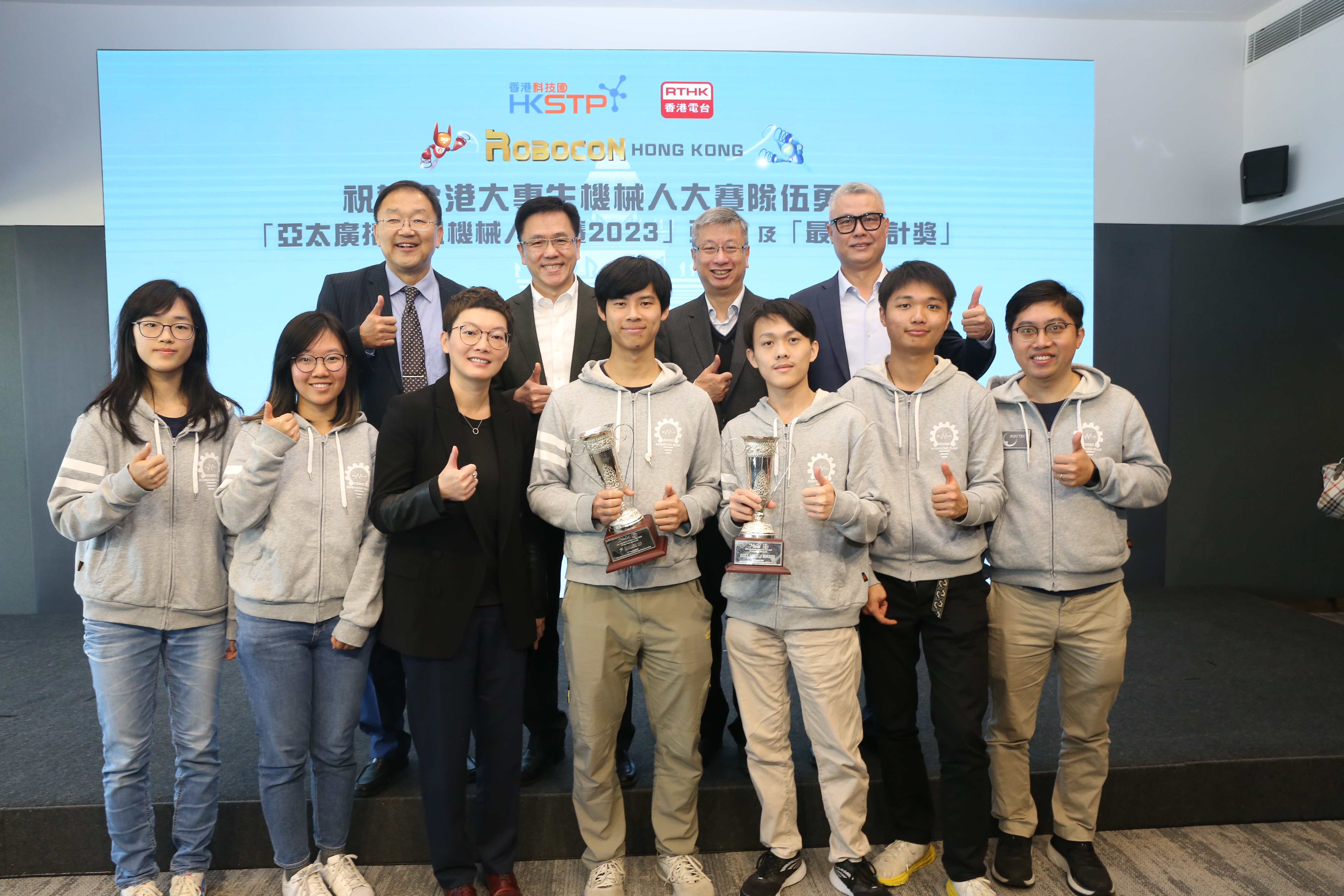 Hong Kong Science and Technology Parks Corporate (HKSTP) and Radio Television Hong Kong (RTHK) had announced a significant partnership at their collaboration agreement signing ceremony held on 5 January 2024 (Friday), with the aim to drive advancements in digital innovation and empower the future of next generation leaders. Way forward strategies especially with Robocon had been elaborated at the Ceremony. HKSTP and RTHK will tap into Hong Kong’s AI and Robotics (AIR) talent by jointly organising the International ABU Robocon in 2026. By hosting the regional competition, HKSTP and RTHK hope to nurture cross-disciplinary expertise in AI and robotics among education institutions and boost the city’s standing as a hub for world-class AI and broader I&T development. Being the Champion of Robocon Hong Kong Contest 2023, “The Lord of the Rings” team from CUHK represented Hong Kong at the ABU Robocon 2023 in last August and defeated 13 champion teams to win the first runner-up and the Best Design Award. To recognize the excellent performance of CUHK Team, the CUHK Robocon Team 2023 was invited to join and witness the kickstart of this meaningful alliance, a congratulatory photo was taken at the Ceremony. |