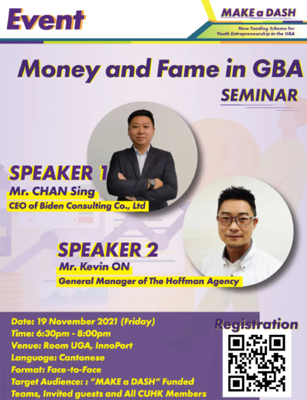 在本次研讨会上,拜登咨询有限公司首席执行官陈升先生和霍夫曼公关公司(香港)总经理Kevin ON先生将分享他们在大湾区寻找创业资助和开展市场营销的技巧。