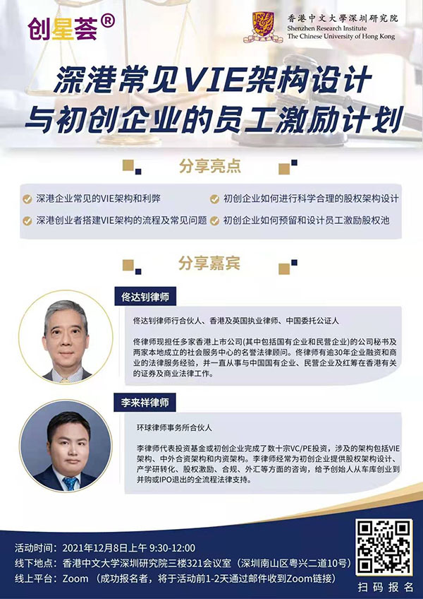 基于以上问题,香港中文大学深圳研究院众创中心将于12月8日上午,开展主题为“「创星荟」深港常见VIE架构设计与初创企业的员工激励计划”讲座,特邀专业律师团从宏观及实操角度切入,传授深港企业VIE架构搭建流程及员工激励计划制定及实施要点。