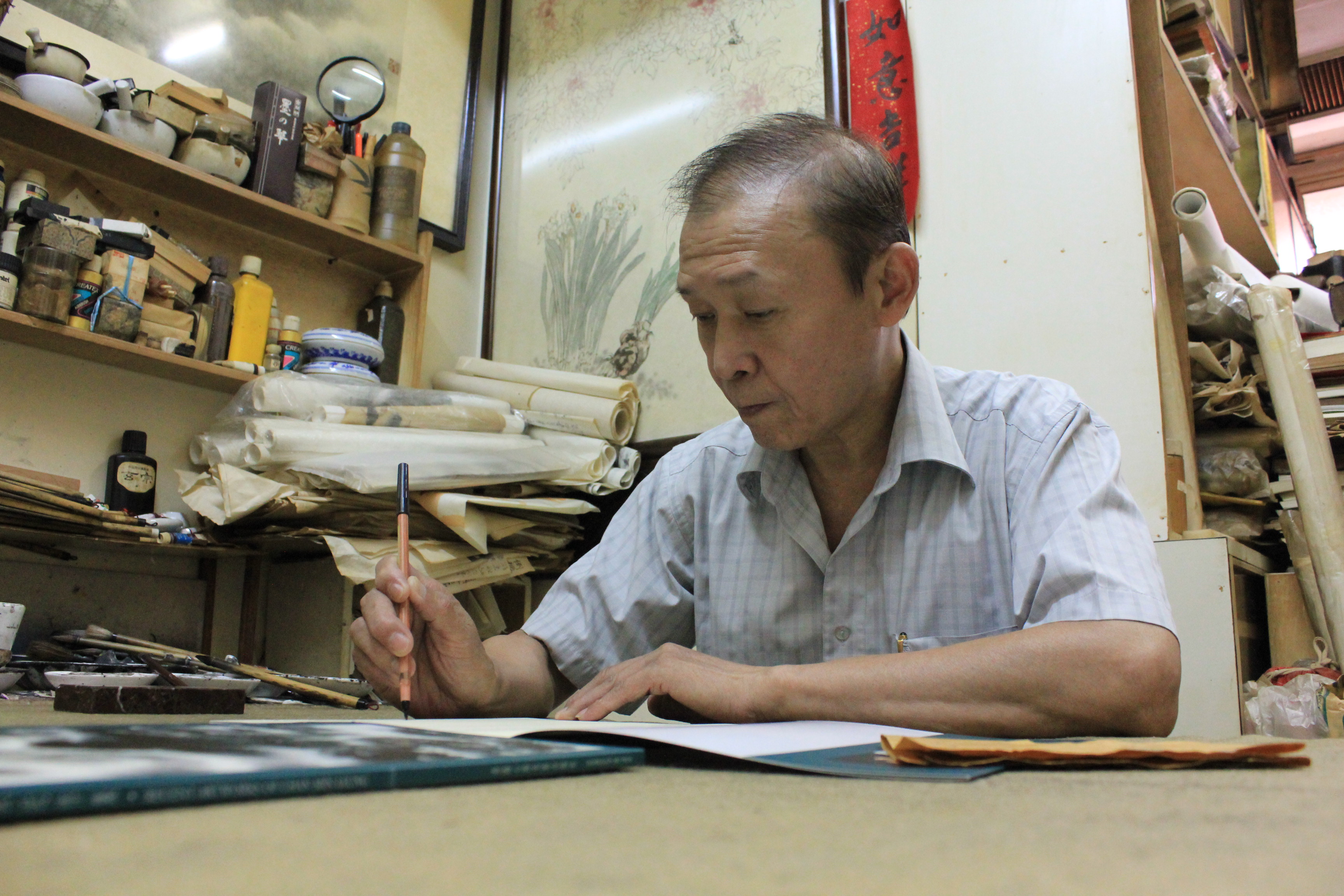 In order to spare more time for painting, he soon closed the bakery and went to work in a carving factory. He also taught Chinese painting at a community centre and worked for a theatre company, both onstage and behind the scenes. Chan says he was lucky because his boss at the carving factory supported his painting and allowed him to be absent on weekdays to teach at the community centre.