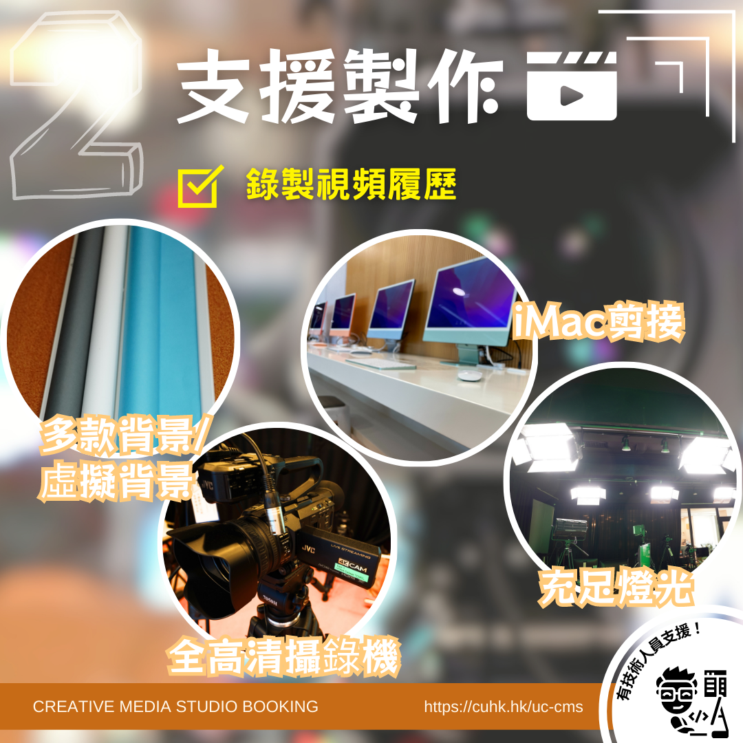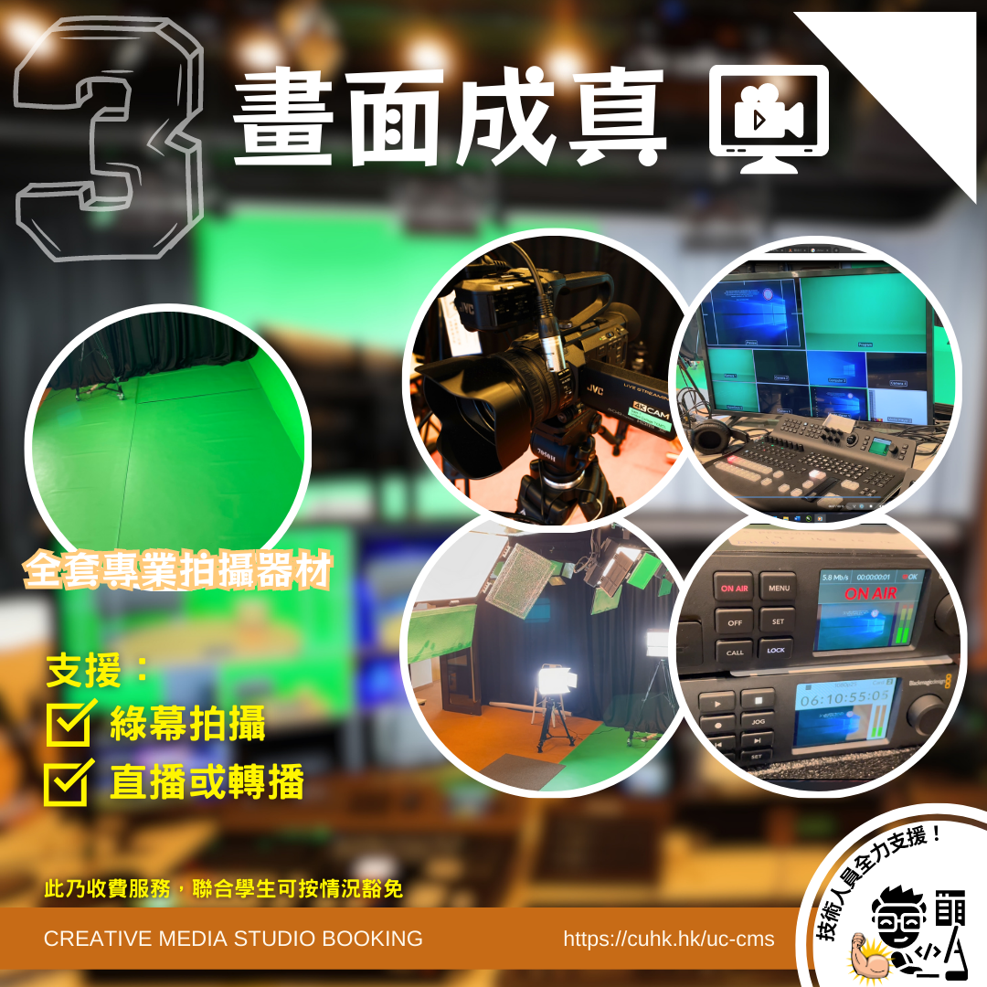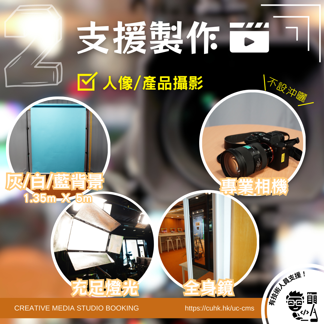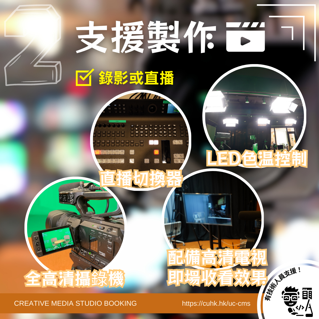 創意多媒體製作間的專業拍攝器材齊全,可以支援多種製作,例如綠幕拍攝、越洋講座、直播或轉播等。由事前的準備,到當天的支援,全為每項拍攝度身訂製。工作人員及後也會指導同學一些簡單的剪接技巧。